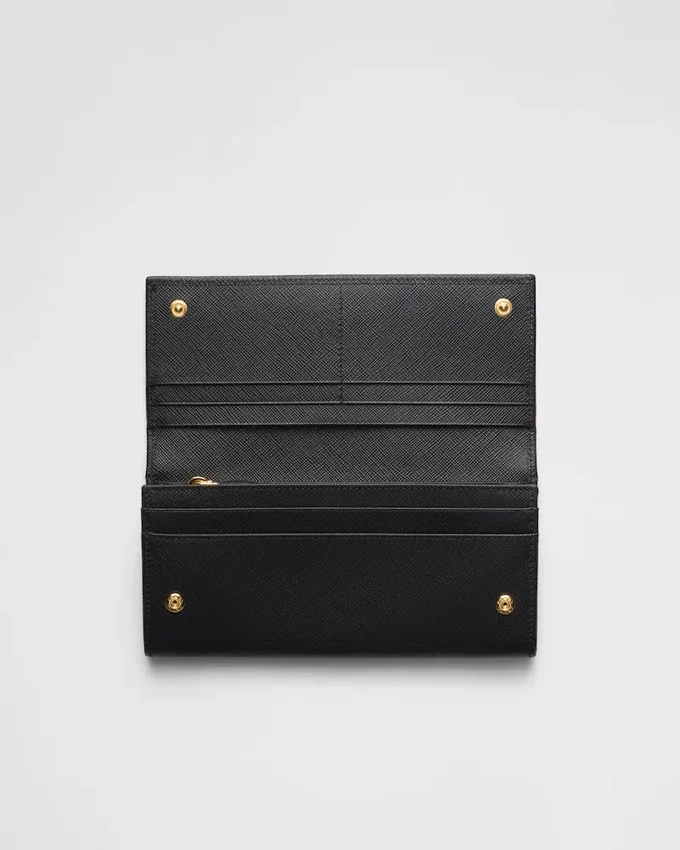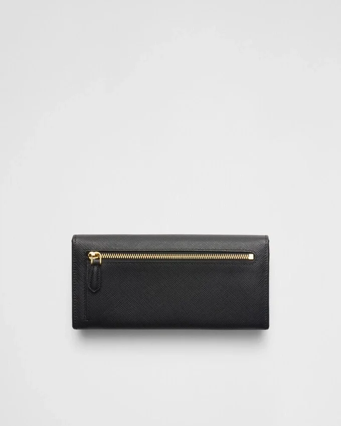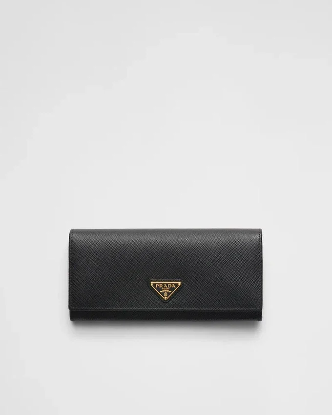 Decorated with the Triangle Prada Logo, This Flap Wallet is Crafted in Saffiano Leather. The Snap Closure Opens to Various Card Slots and Pockets.