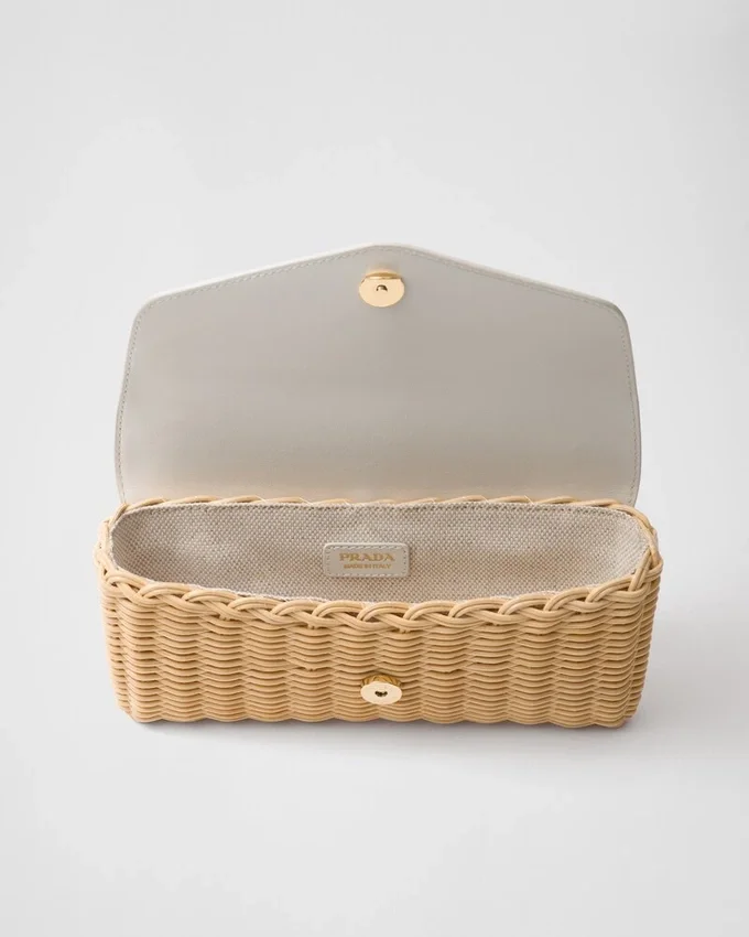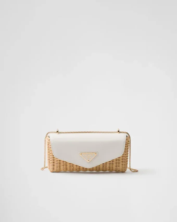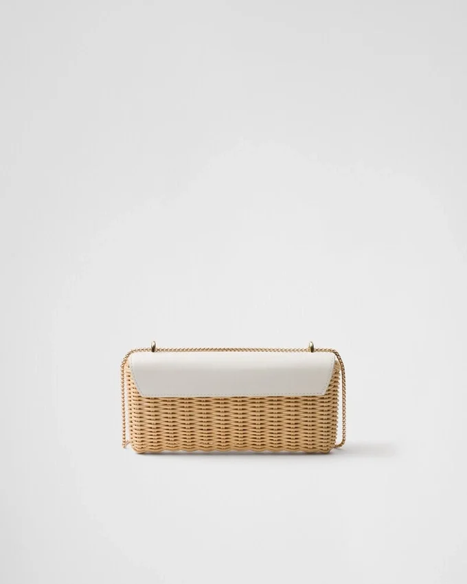 This Wicker Mini Bag with a Refined Vintage-Inspired Mood is Defined by Its Woven Workmanship and Leather Details. The Unusual Combination of Different Materials Brings to Mind the Hybrid Concept That Has Always Pervaded the Prada Narrative. The Enameled Metal Triangle Logo, an Historical Symbol of the Brand, Embellishes the Design with Summery Charm.