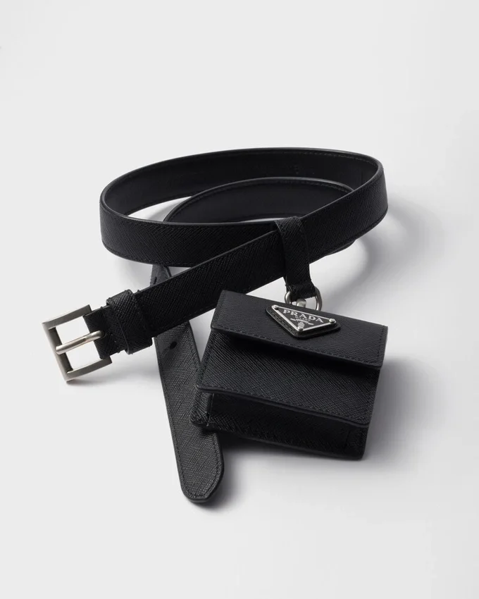 This Refined and Multifunctional Belt in Saffiano Leather Features a Sleek Design Enriched by a Removable Mini-Pouch. The Enameled Metal Triangle Logo Adds Its Signature Touch to the Accessory with Contemporary Elegance.