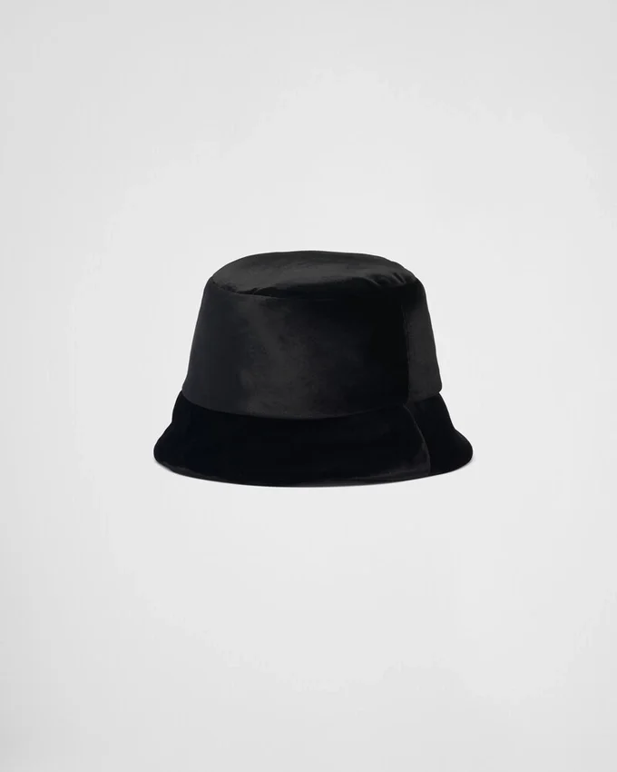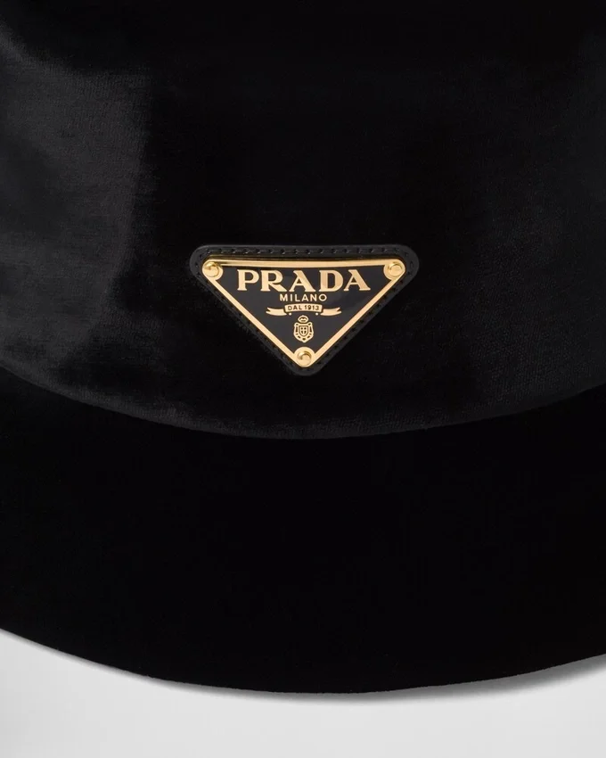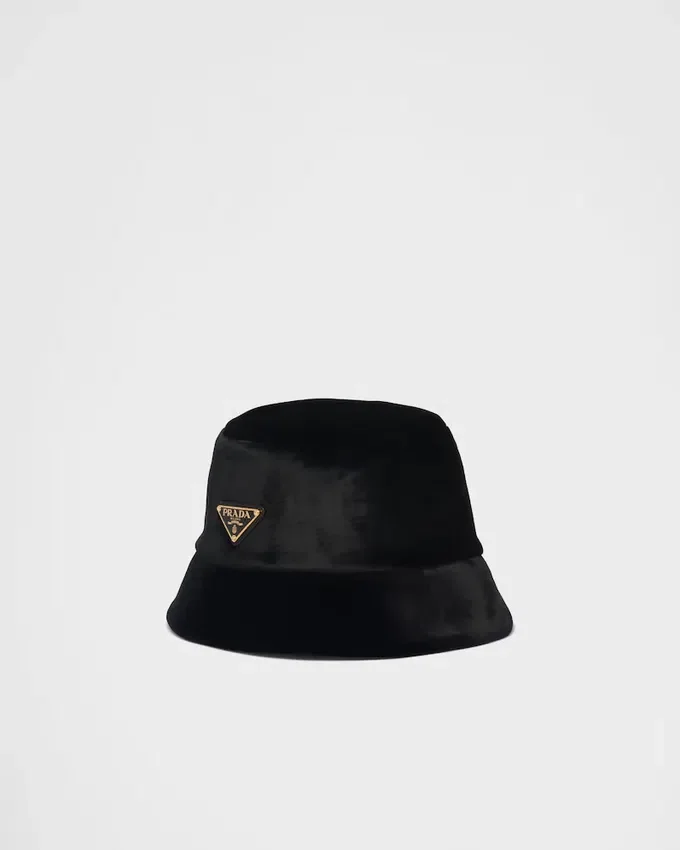The Bucket Hat, Prada’s Iconic Accessory, is Made of Soft Velvet and Decorated with the Enameled Metal Triangle Logo.