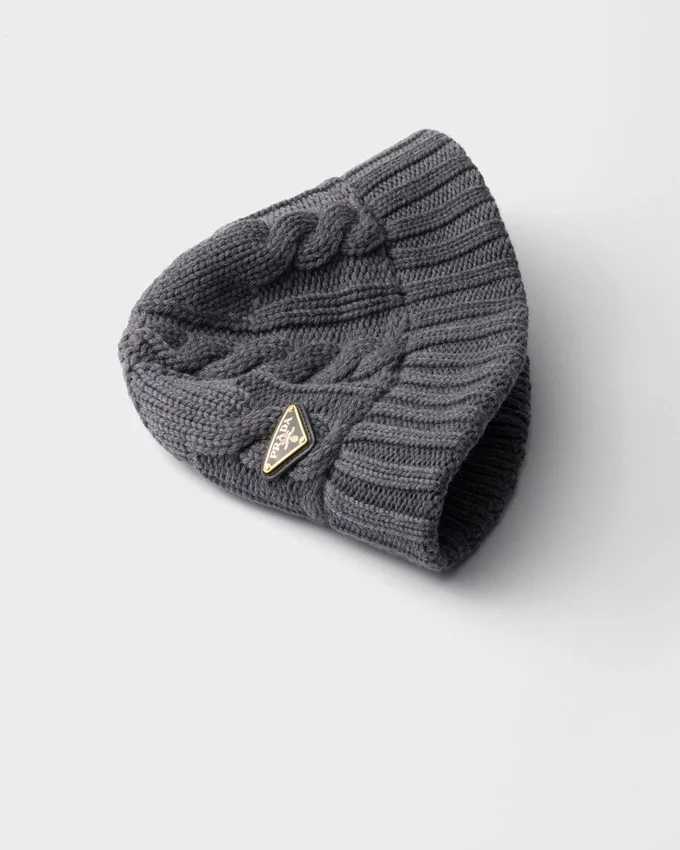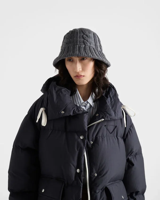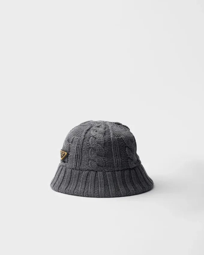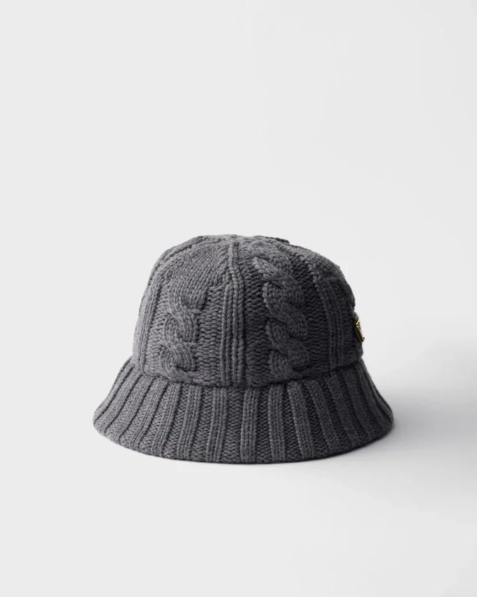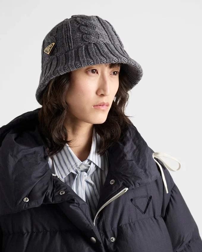 The Iconic Bucket Hat is Reinterpreted with a Soft Texture with Wintry Allure. Made with a Cable-Knit Pattern, the Accessory is Decorated with the Enameled Metal Triangle Logo.