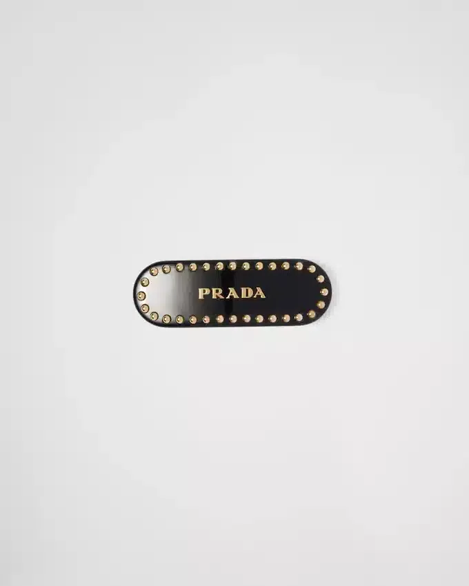 This Hair Clip is Decorated with the Prada Logo and Has Metal Studs.
