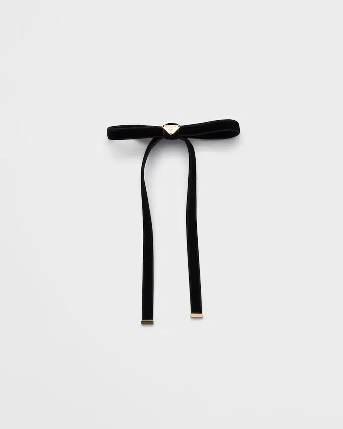 The Feminine and Sophisticated Hair Bow is Reinterpreted with a Precious, Contemporary Design. The Velvet Accessory is Embellished with the Metal Triangle Logo.