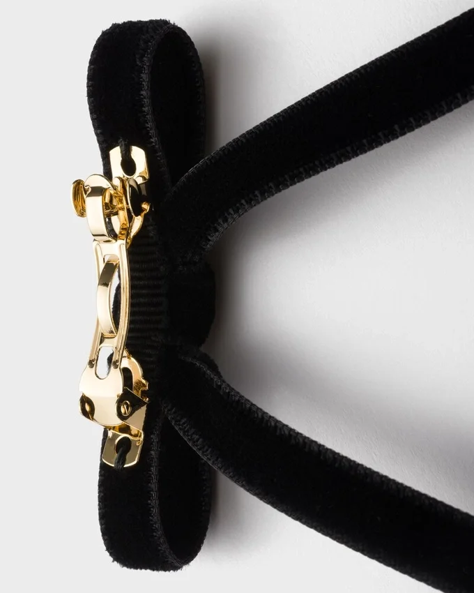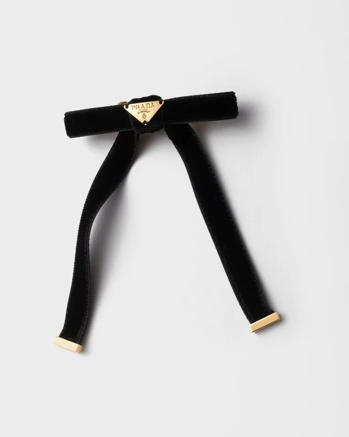 The Feminine and Sophisticated Hair Bow is Reinterpreted with a Precious, Contemporary Design. The Velvet Accessory is Decorated with the Metal Triangle Logo.