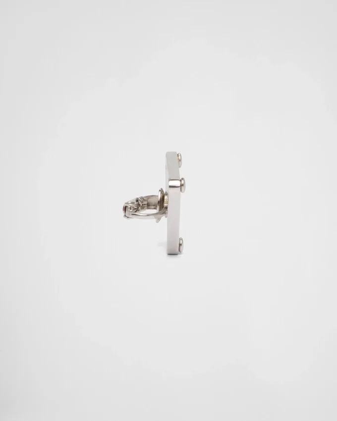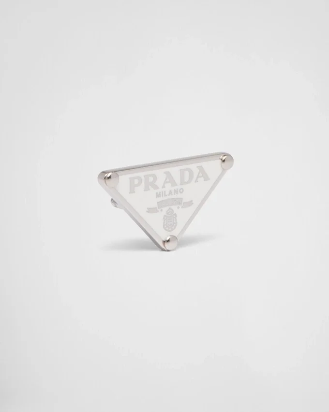 Prada’s Historic Symbol Decorated with Enamel Defines This Single Earring Worn on the Right. Iconic and Sleek, the Triangle Logo is the Protagonist of a New Line of Jewelry Made of 925 Sterling Silver That Reinterprets Punk Influences in a Modern Way.