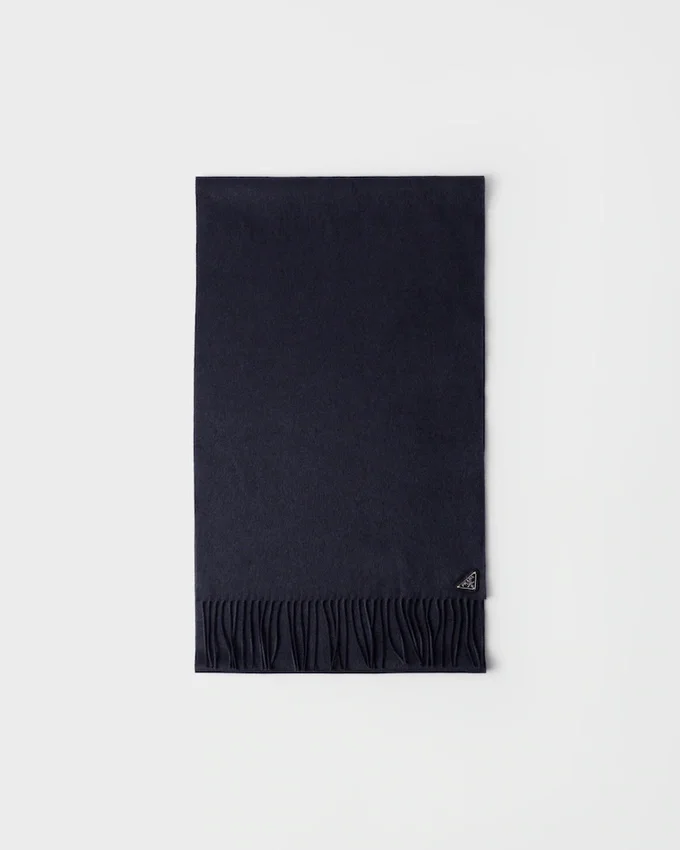 A Luxurious Silk and Cashmere Blend Enhances the Sleek Design of This Scarf with Classic Fringed Edges. The Soft and Refined Accessory is Embellished with the Iconic Enameled Metal Triangle Logo.