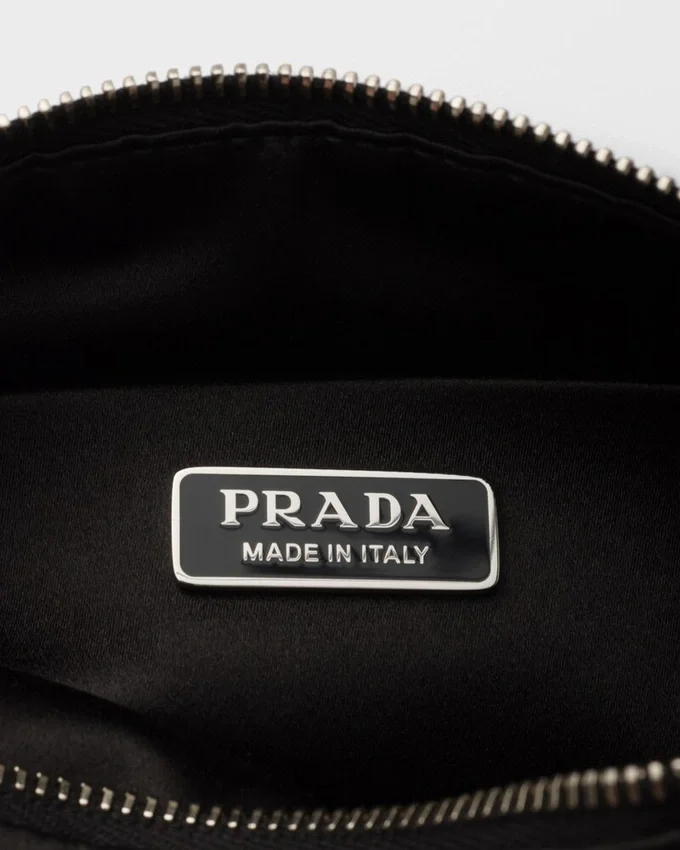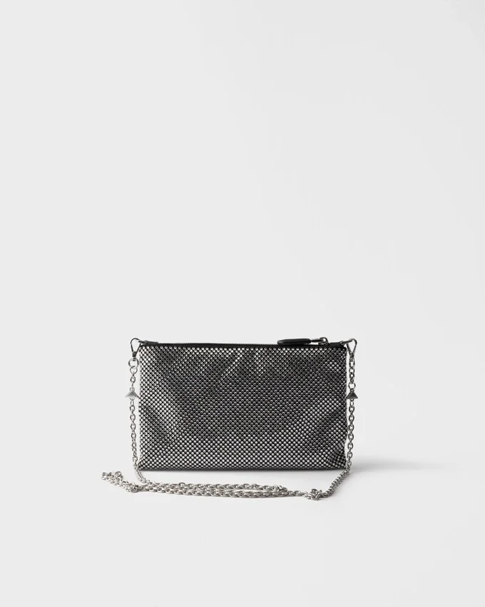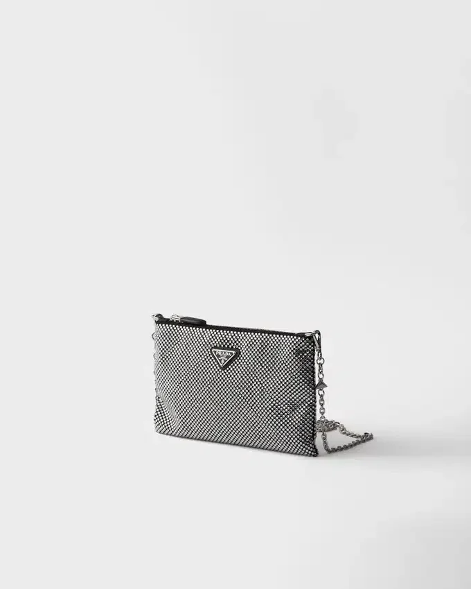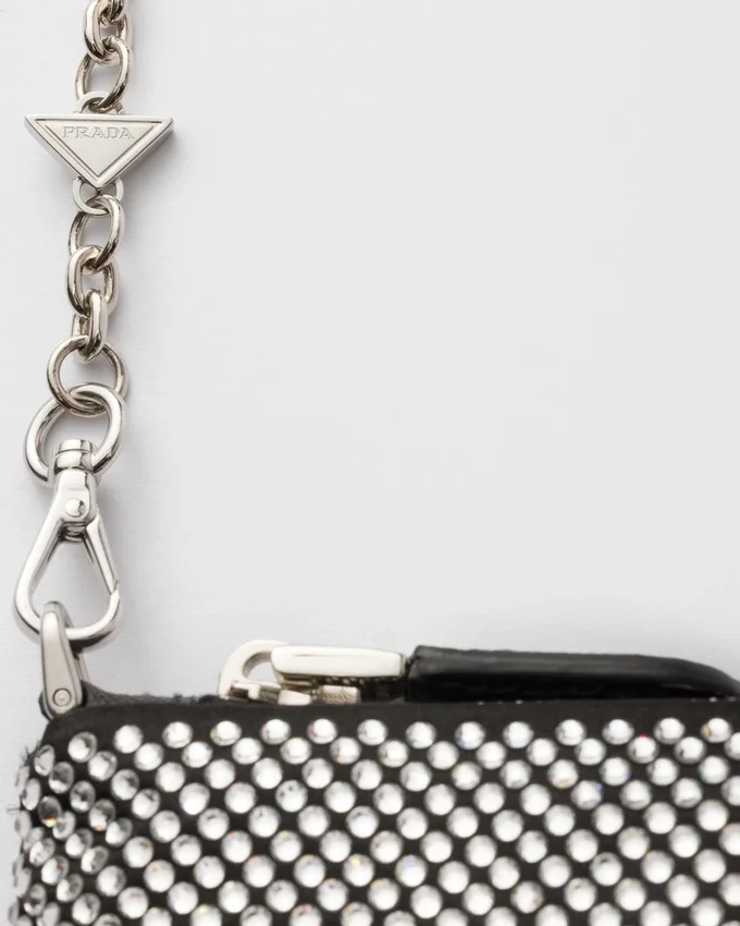 Sleek Lines and Precious Details Define This Satin Clutch Covered with Crystals Applied by Hand. The Accessory, Completed with a Chain Shoulder Strap, is Decorated with the Iconic Enameled Metal Triangle Logo.