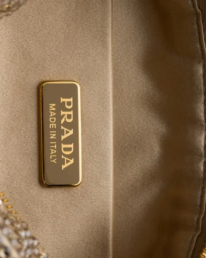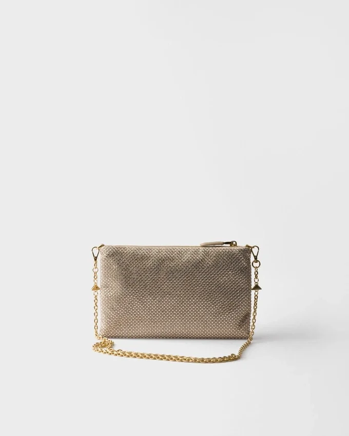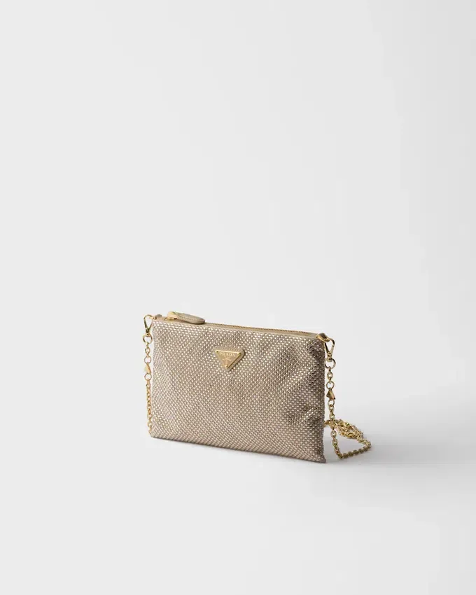 Sleek Lines and Precious Details Define This Satin Clutch Covered with Crystals Applied by Hand. The Accessory, Completed with a Chain Shoulder Strap, is Decorated with the Iconic Enameled Metal Triangle Logo.