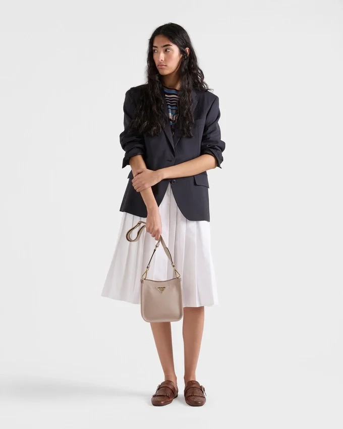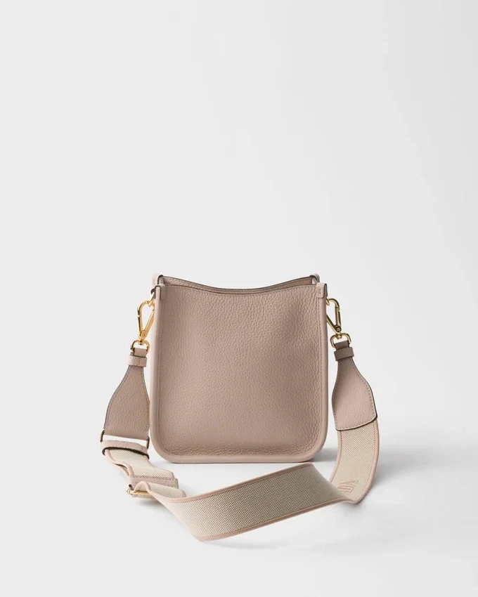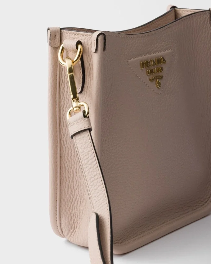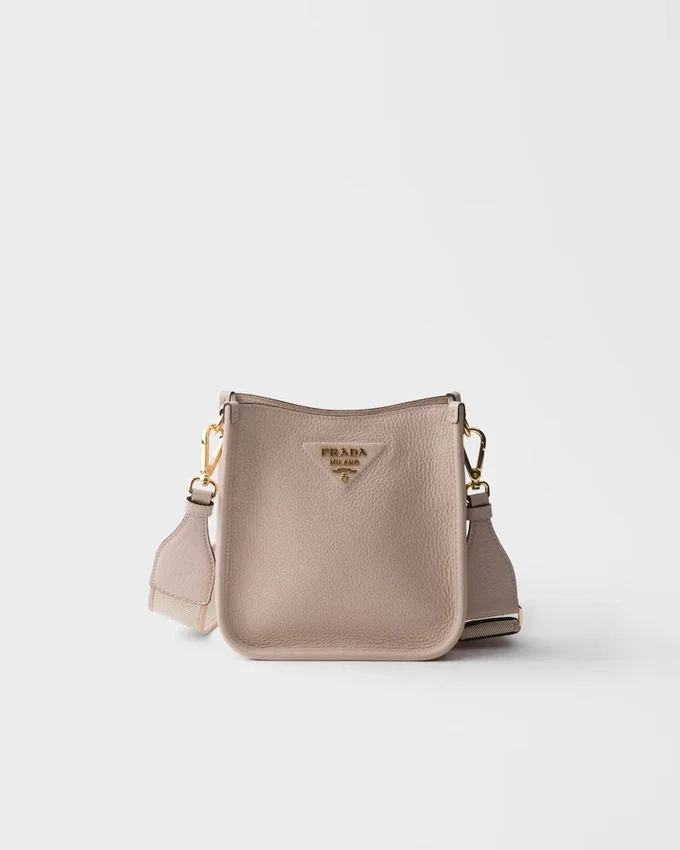 This Versatile Leather Bag Boasts a Sleek and Functional Design. The Shoulder Strap Adds a Sporty Element to the Accessory, Elevated by the Metal Logo Lettering That Stands out on the Simple Yet Distinctive Geometry of the Iconic Triangle.