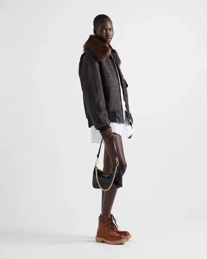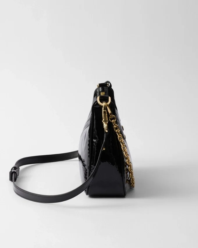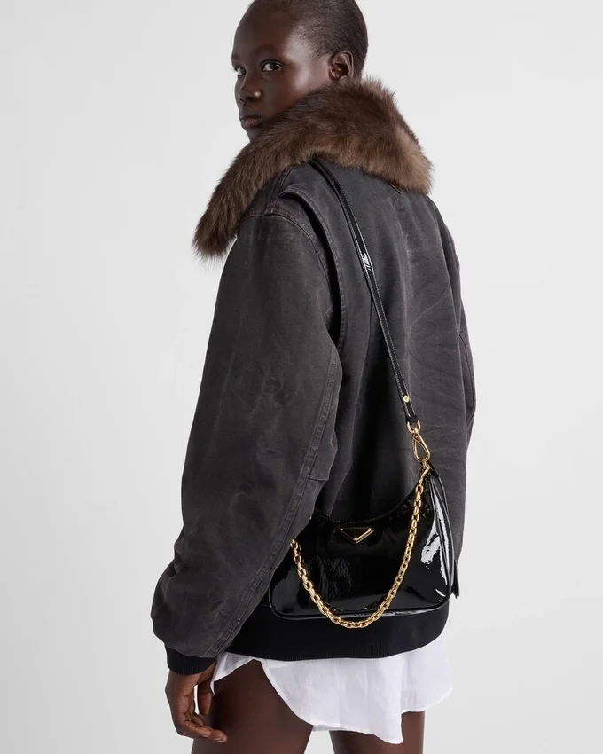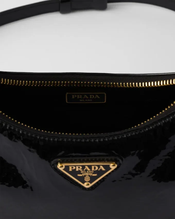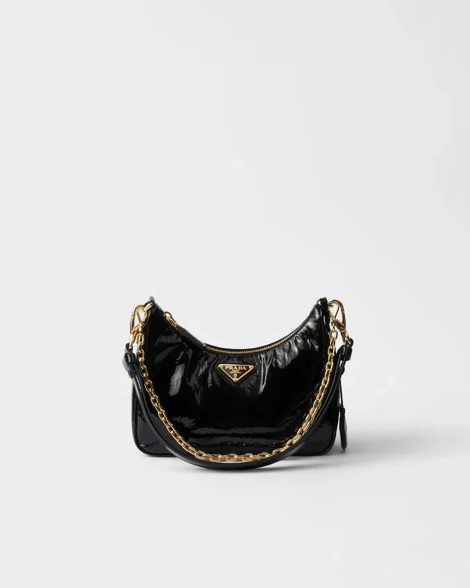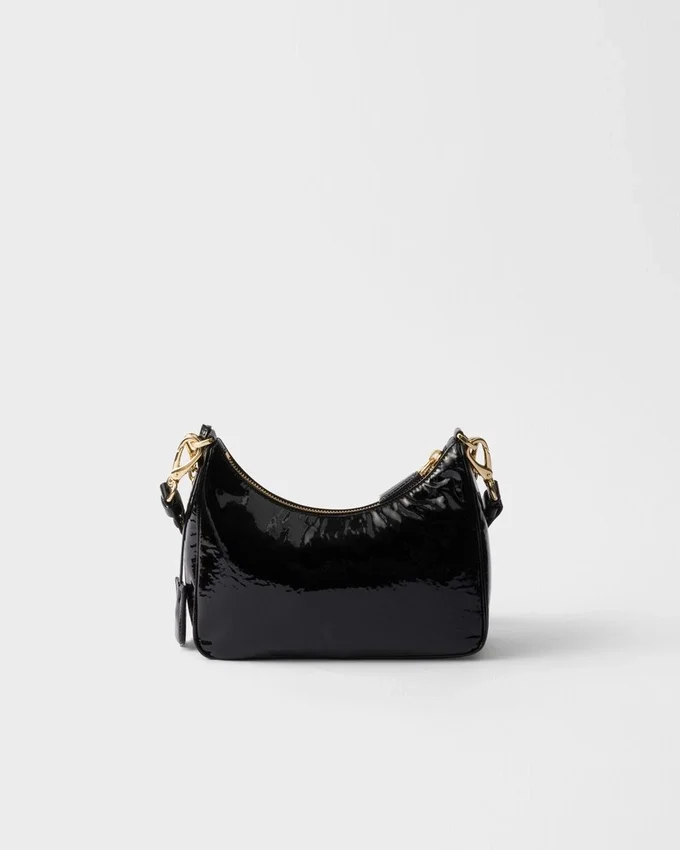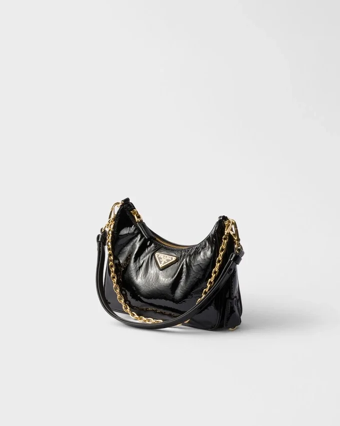 The Lustrous Touch of Naplak Patent Leather and the Elegance of Gold-Tone Hardware Give Sophisticated, Versatile Allure to This Mini-Bag Decorated with the Iconic Triangle Logo.