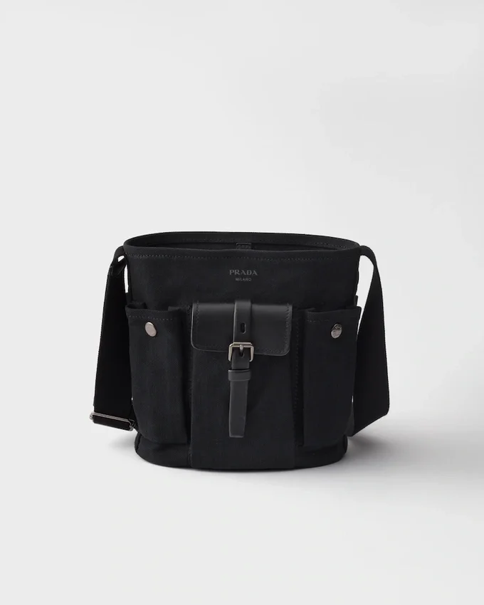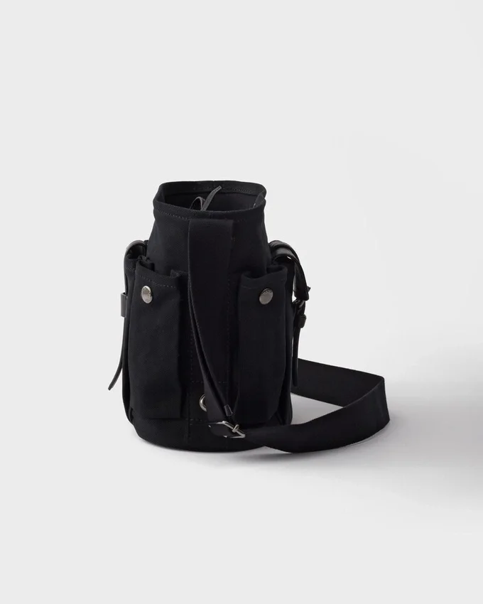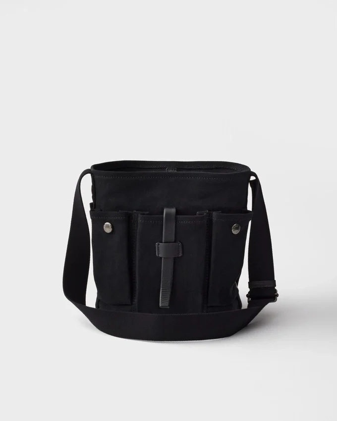 Pockets, Both Functional Elements and Decorative Details, Shape the Silhouette of This Canvas and Leather Mini Bucket Bag. The Design Plays with Contrasts in Texture That Characterize This Versatile and Distinctive Accessory, an Unexpected Balance Between Utility Style and Artisanal Refinement.