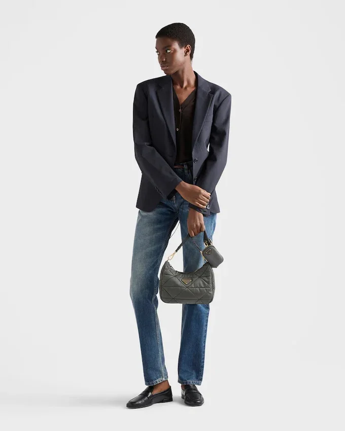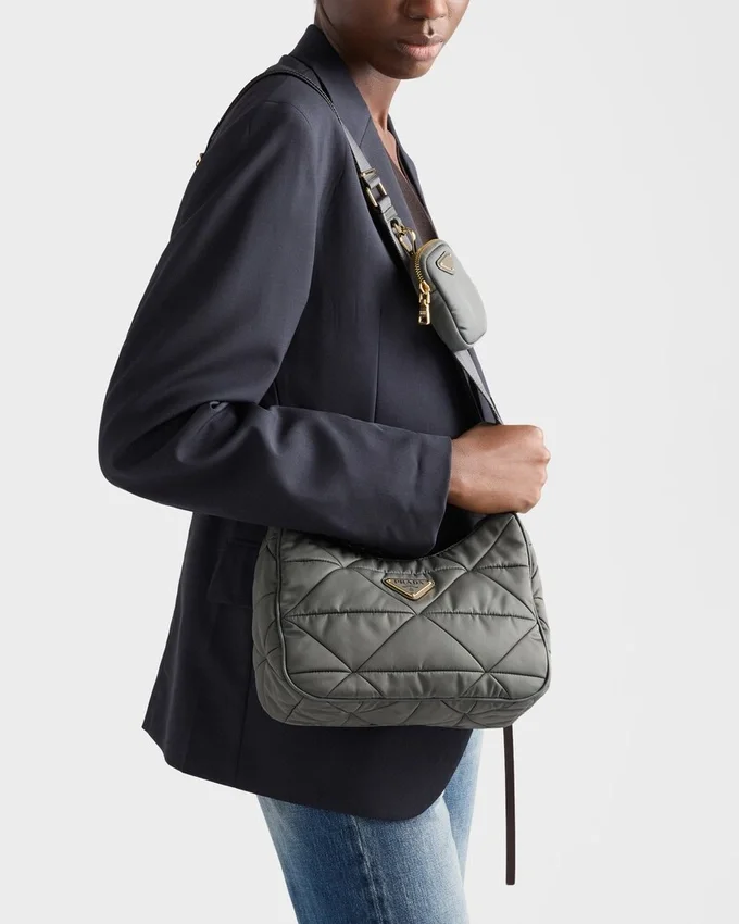 A Triangle Motif Characterizes This Padded Hobo Bag, Crafted from Re-Nylon with a Soft Design. The Style is Adorned with the Iconic Enamel Metal Triangle Logo and Comes with a Detachable Nylon Zipper Pouch for Added Functionality and a Contemporary Touch. For Sustainable Care to Preserve the Product’s Characteristics and Reduce Microfiber Shedding, We Recommend Not Washing the Item Too Often. Let the Product Air out After Every Use and Have It Dry Cleaned at a Specialized Ecological Dry Cleaners.