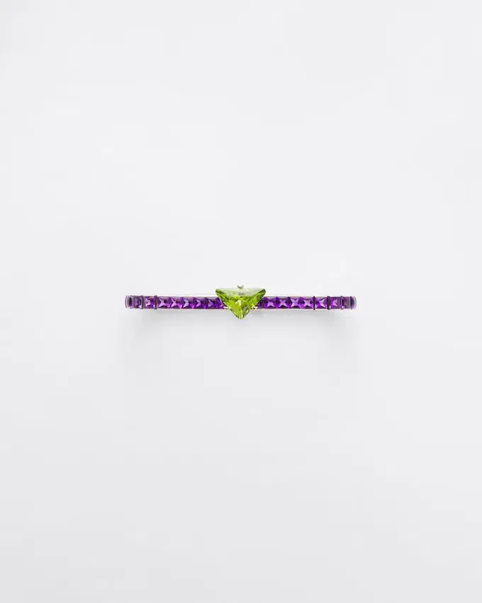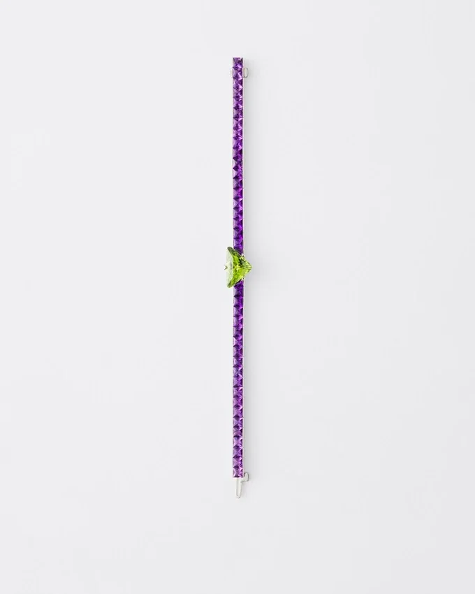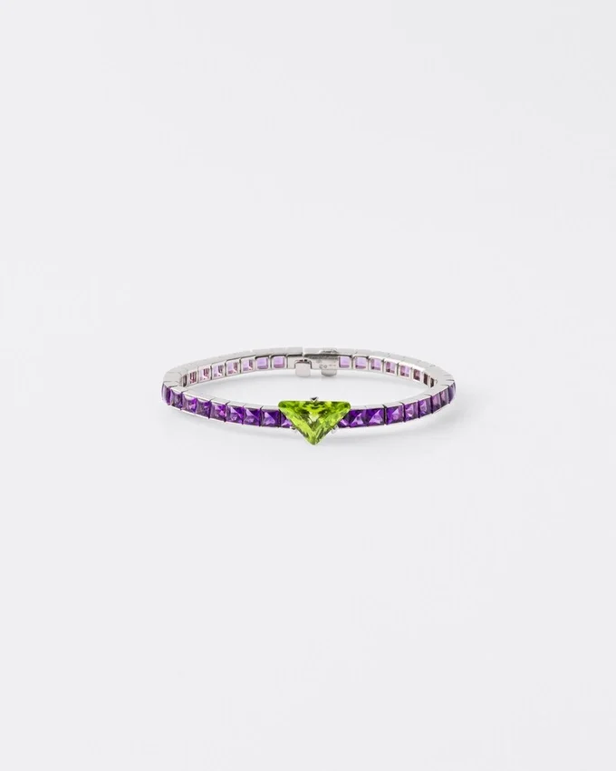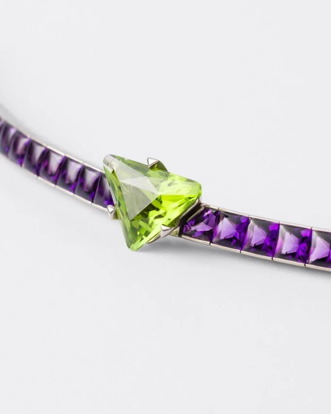 Chosen for Their Exceptional Chromatic Value, Colored Gems Are the Protagonists of the Prada Fine Jewelry Couleur Vivante Collection. A Study of Sculptural Lines, Harmonies and Contrasts Inspire the Design of This White Gold Bracelet, Where the Intensity of Amethyst Meets the Vibrant Brilliance of Gold-Green Peridot Enhanced by the Distinctive Prada Cut. The Unexpected Juxtaposition Suggests a Sophisticated and Unconventional Color Language That Reflects Prada’s Soul.