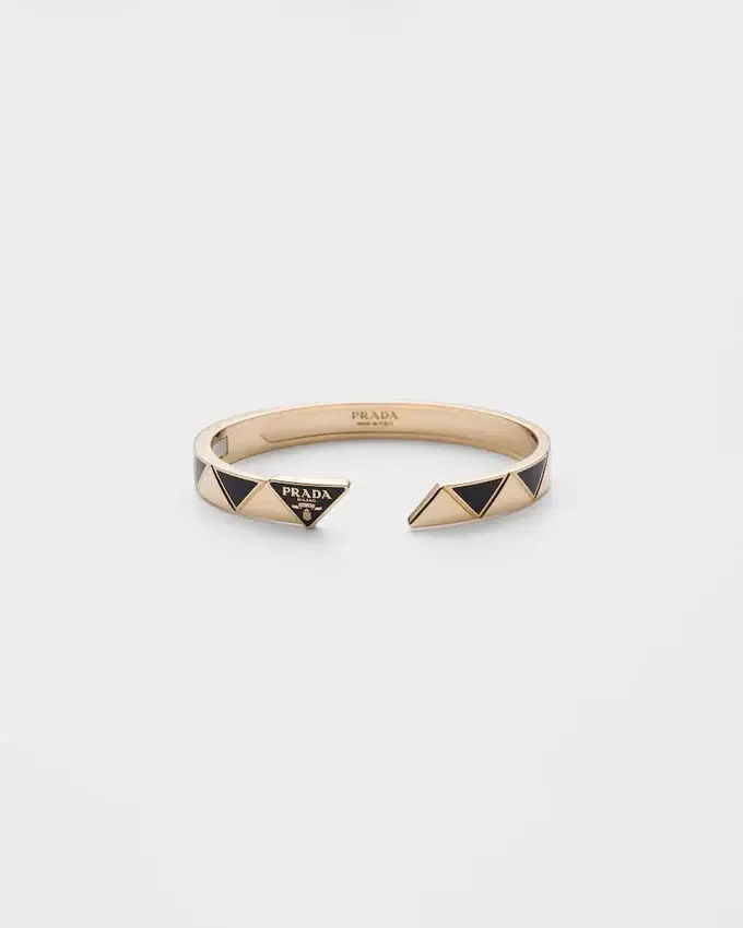 The Triangle, Prada’s Signature Element, is Reimagined for the Fine Jewelry Collection. First Introduced in 1913 as a Hallmark on Mario Prada’s Steamer Trunks, the Triangle Stands out on This Oval Bangle Bracelet with Contemporary Accents. Decorated with a Motif That Recalls the Iconic Geometric Shape, the Bracelet Features a Modern Chromatic Contrast of Gold and Black Ceramic That Underlines Its Versatile, Modern Style.