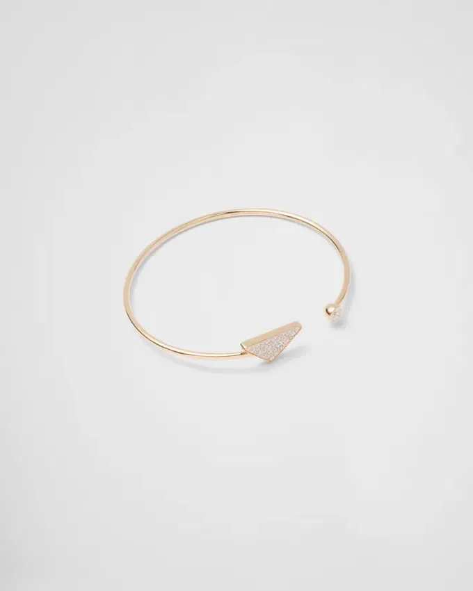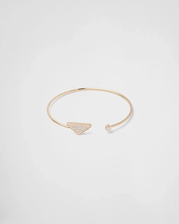 A Pava of Diamonds Embellishes and Illuminates the Surface of the Iconic Triangle, First Introduced in 1913 as a Hallmark on Mario Prada’s Steamer Trunks and Now the Protagonist of This Fine Jewelry Collection. The Juxtaposed Diamonds Create an Original Play of Light on This Bangle Bracelet Made of Recycled Yellow Gold, Accentuating the Elegance of the Line and the Artisan Know-How Used to Produce Unique Designs. A Diamond Mounted on the Tip Embellishes the Design of This Jewel.