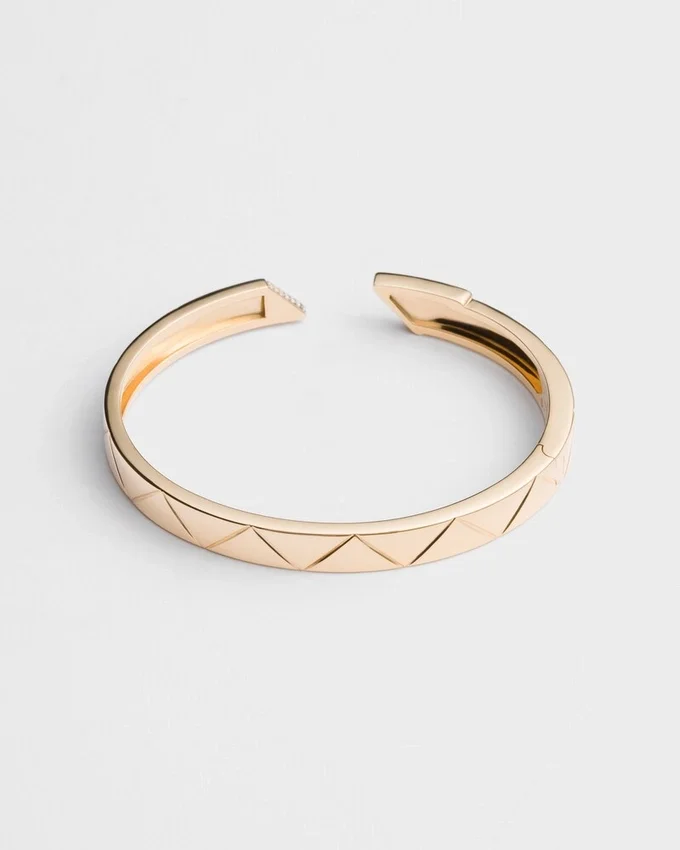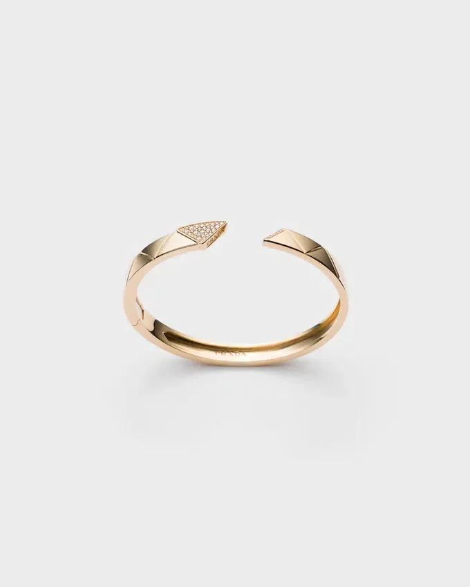 A Pava of Diamonds Embellishes and Illuminates the Surface of the Iconic Triangle, First Introduced in 1913 as a Hallmark on Mario Prada’s Steamer Trunks and Now the Protagonist of This Fine Jewelry Collection. The Juxtaposed Diamonds Create an Original Play of Light on This Bangle Bracelet Made of Recycled Yellow Gold, Accentuating the Elegance of the Line and the Artisan Know-How Used to Produce Unique Designs. This Bracelet with a Modernist Design Has a Hidden Hinge Clasp for a Functional Yet Sophisticated Fit.