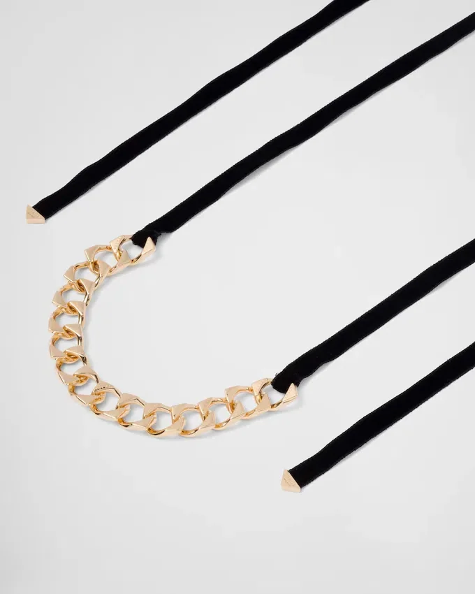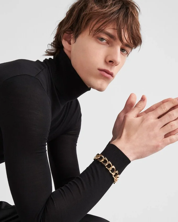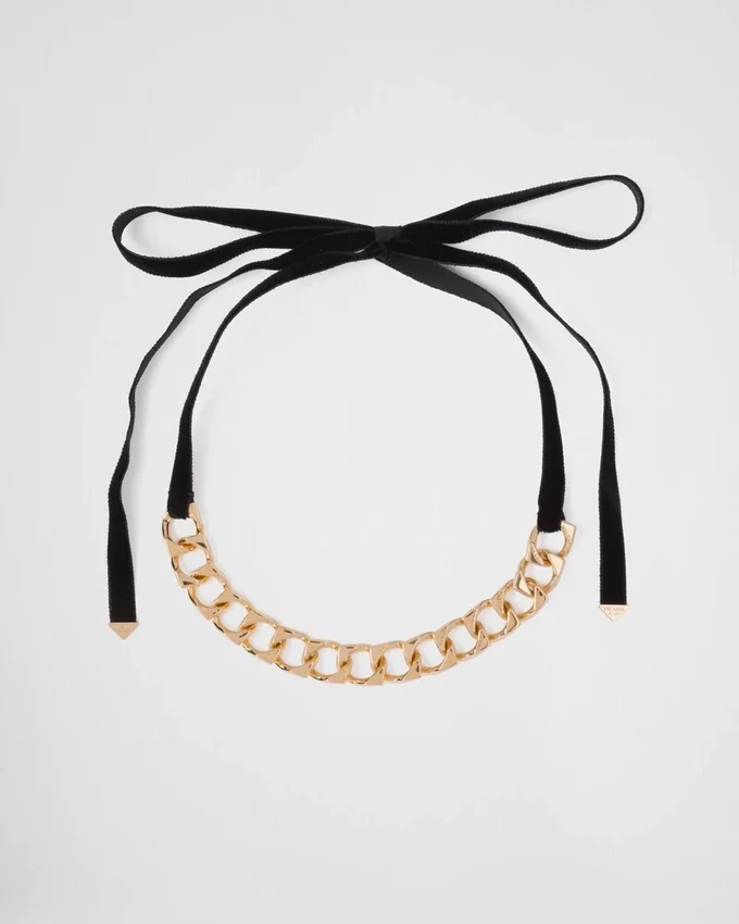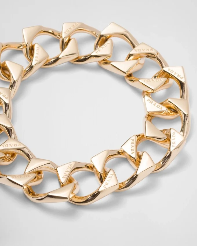 Part of Prada’s Dna Since the Early 2000S, the Image of the Chain Assumes New Shapes and New Meanings. For the Fine Jewelry Collection, the Chain is Given a Bold, Sophisticated Design Embodying Strength and Elegance. Each Link of This Bracelet Made of Recycled Yellow Gold is Inspired by the Emblematic Triangular Shape of the Brand, Creating a Refined Yet Bold Silhouette. A Special Clasp on Both Ends Makes It Possible to Turn the Bracelet into a Choker with the Use of a Delicate Velvet Ribbon with Golden Tips.