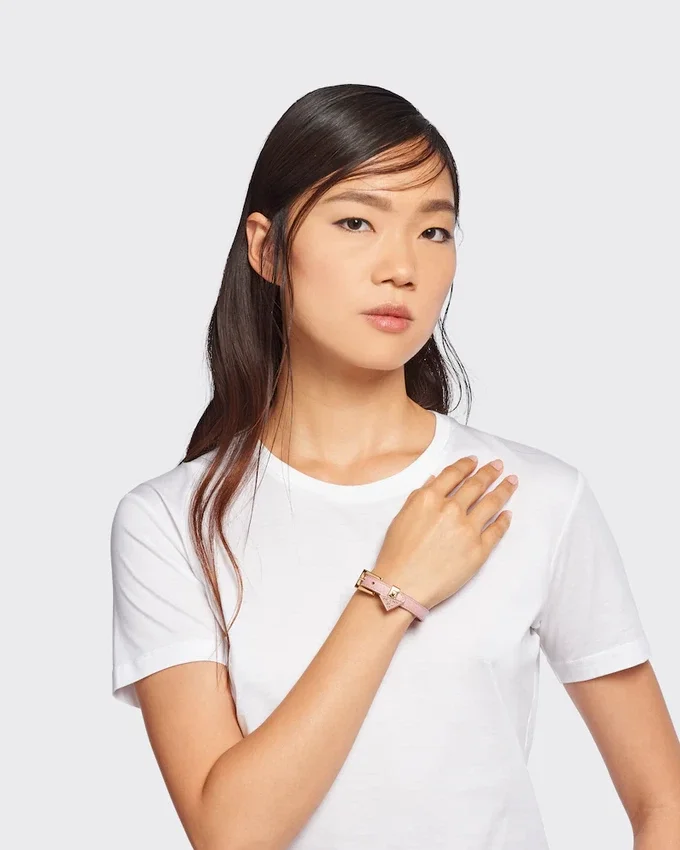 This Elegant Saffiano Leather Bracelet Decorated with a Metal Triangle Logo Charm Stands out for Its Feminine Design.