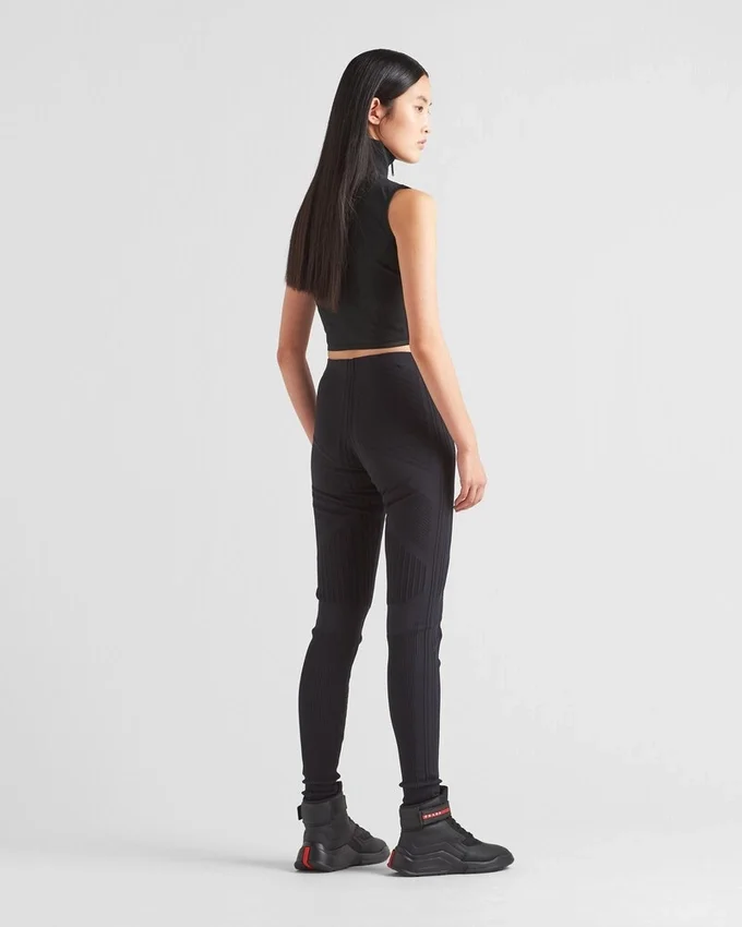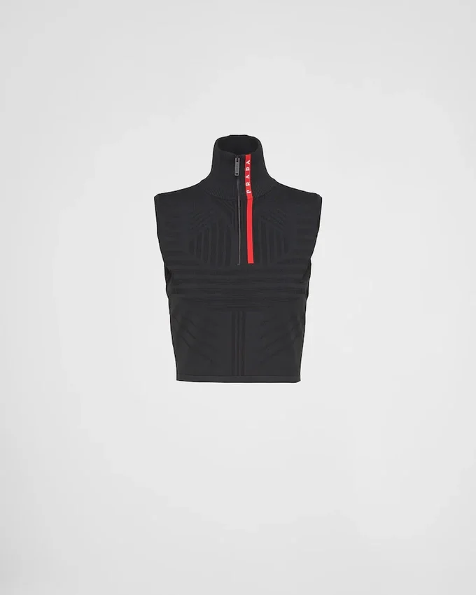 A Cropped, Fitted Silhouette Characterizes This Sleeveless Top That Blends Technical Elements and a Sporty Inspiration. Made from High Quality Post-Consumer Recycled Japanese Polyester and Lycra Yarns, Nylon Tech Rec is a Naturally Stretchy, Lightweight and Water-Repellent Knit. Featuring a Piqua Motif with Contoured Lines, the Design with Ribbed Knit Turtleneck is Accented with a Front Zipper Reminiscent of the Sports World and the Embroidered Prada Linea Rossa Logo. This Product Does Not Contribute to the Sea Beyond Educational Program.