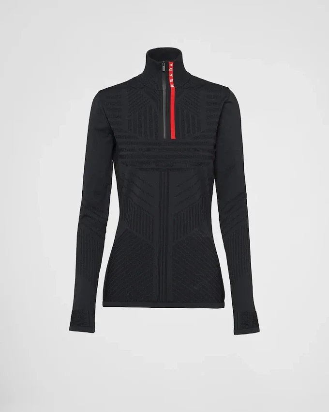 A Fitted Silhouette Characterizes This Long-Sleeved Jersey That Blends Technical Elements and a Sporty Inspiration. Made from High Quality Post-Consumer Recycled Japanese Polyester and Lycra Yarns, Tech Rec Nylon is a Naturally Stretchy, Lightweight and Water-Repellent Knit. Featuring a Piqua Motif with Contoured Lines, the Design with Ribbed Knit Turtleneck is Accented with a Front Zipper Reminiscent of the Sports World and the Embroidered Prada Linea Rossa Logo. This Product Does Not Contribute to the Sea Beyond Educational Program.