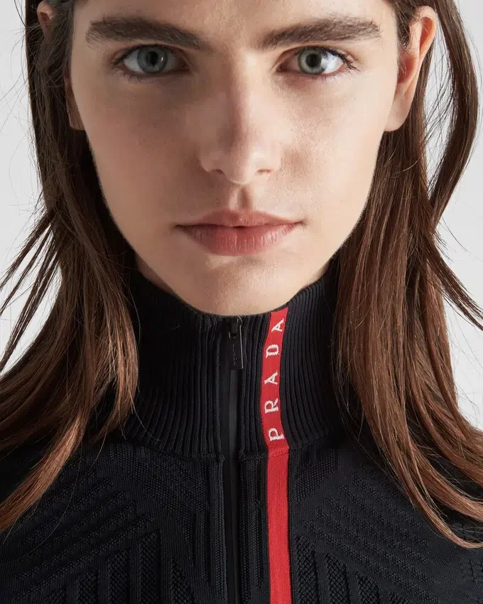 A Fitted Silhouette Characterizes This Long-Sleeved Jersey That Blends Technical Elements and a Sporty Inspiration. Made from High Quality Post-Consumer Recycled Japanese Polyester and Lycra Yarns, Tech Rec Nylon is a Naturally Stretchy, Lightweight and Water-Repellent Knit. Featuring a Piqué Motif with Contoured Lines, the Design with Ribbed Knit Turtleneck is Accented with a Front Zipper Reminiscent of the Sports World and the Embroidered Prada Linea Rossa Logo. This Product Does Not Contribute to the Sea Beyond Educational Program.