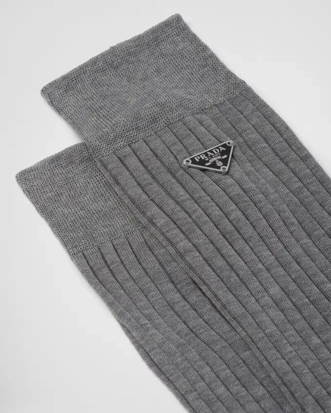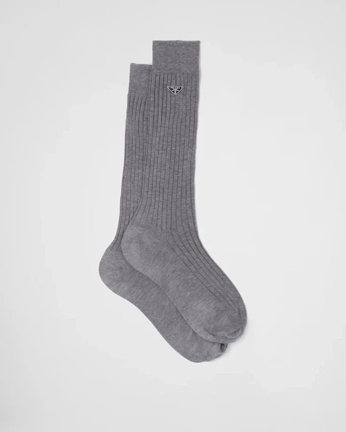 Fine Ribbing Decorates These Mid-Calf Cotton Socks. The Enameled Metal Triangle Logo Stands out on the Side, Adding an Iconic Note to the Socks.