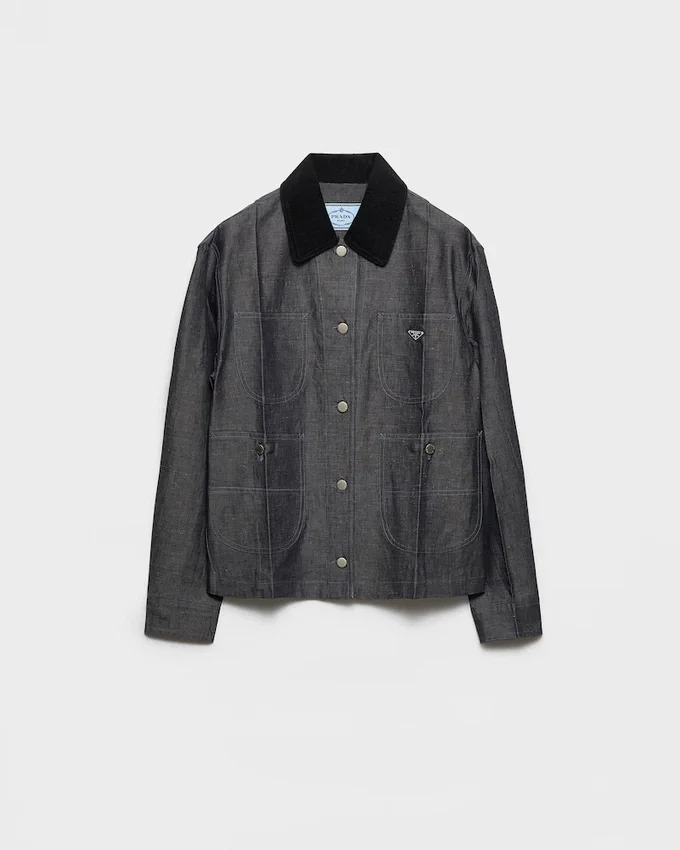 This Caban Jacket Takes the Pragmatic Lines of Workwear and Gives Them a Contemporary Twist. The Style is Made of Chambray Fabric That Defines the Lightweight Garment with a Sleek Aesthetic. The Velvet Collar Enhances the Design Completed with the Enameled Metal Triangle Logo.