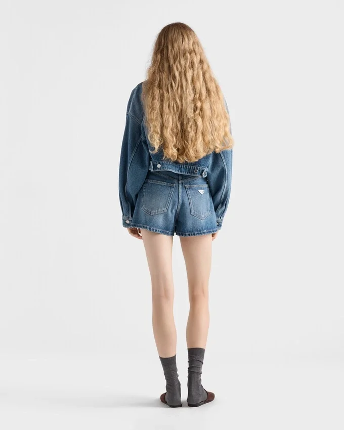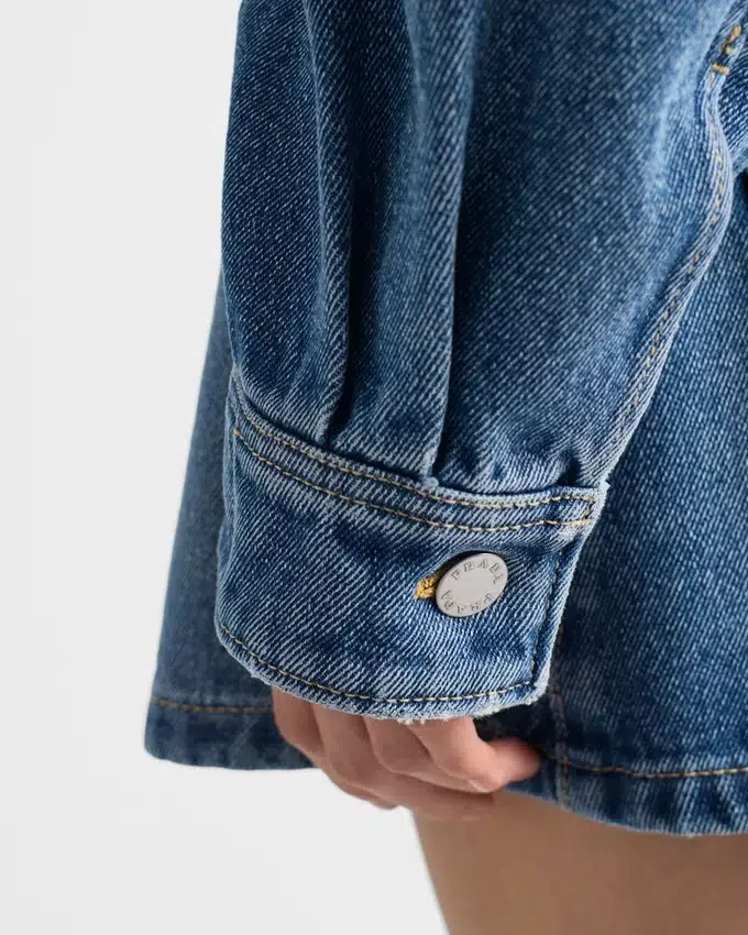 The Denim Jacket is Reinterpreted with a Contemporary Design and Refined Details. The Garment with a Cropped Cut is Embellished with a Leather Collar, While the Enameled Metal Triangle Logo Completes It with an Iconic Note.