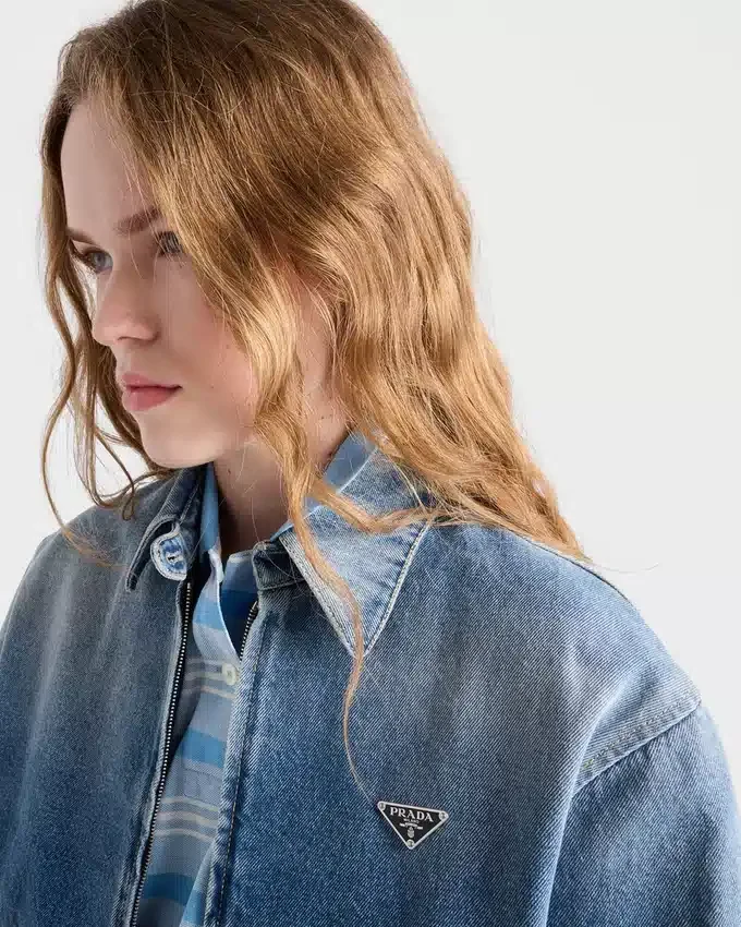 Denim with an Aged Finish Adds Structure and Character to This Blouson Jacket with Sleek Lines. The Versatile Silhouette Defined by Elasticized Cuffs and Hem That Emphasize the Volume is Completed by the Enameled Metal Triangle Logo.