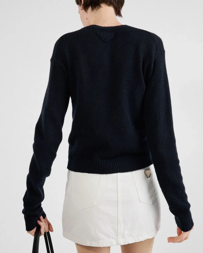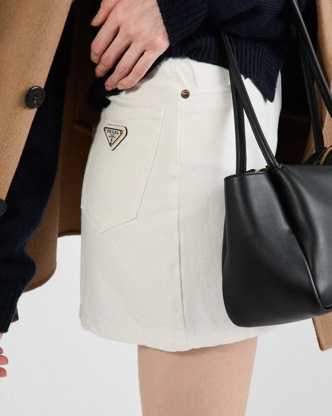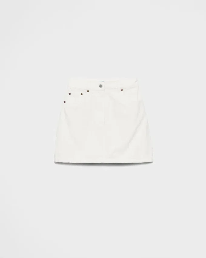 This Denim Miniskirt Features a Silhouette with a High-Rise Waist and is Enriched with the Classic Five Pockets. The Triangle Logo Applied on the Back Pocket Adds Its Iconic Signature Touch to the Garment.
