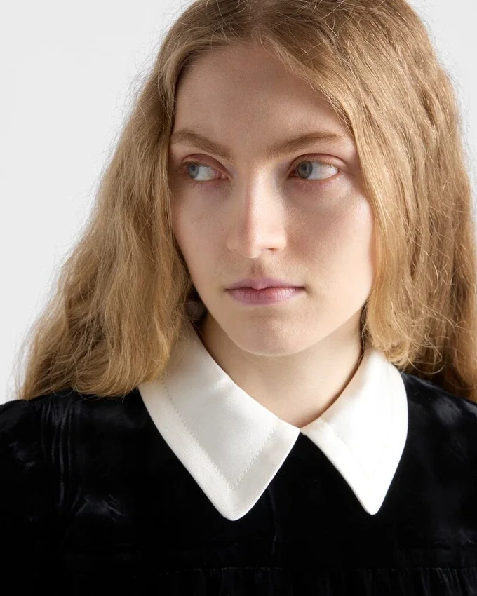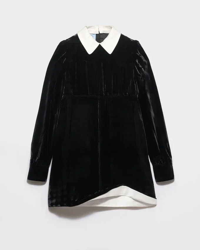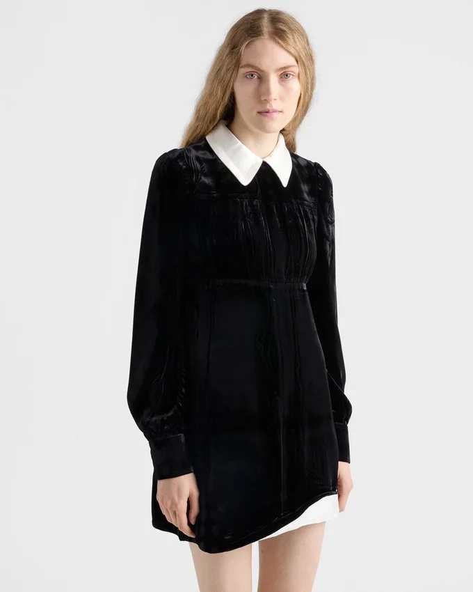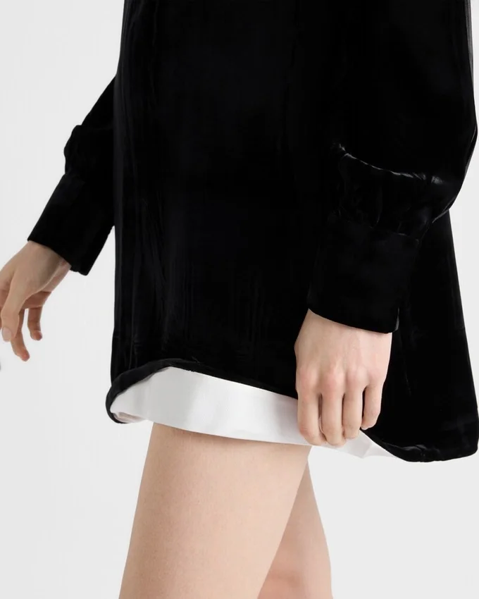 Bon Ton Allure Meets the Rich Texture of Velvet in This Mini-Dress with Sculpted Lines. Retro Atmospheres Mix with Cinematic References to Define a Dynamic Design with Movement as Suggested by the Asymmetrical Hem.