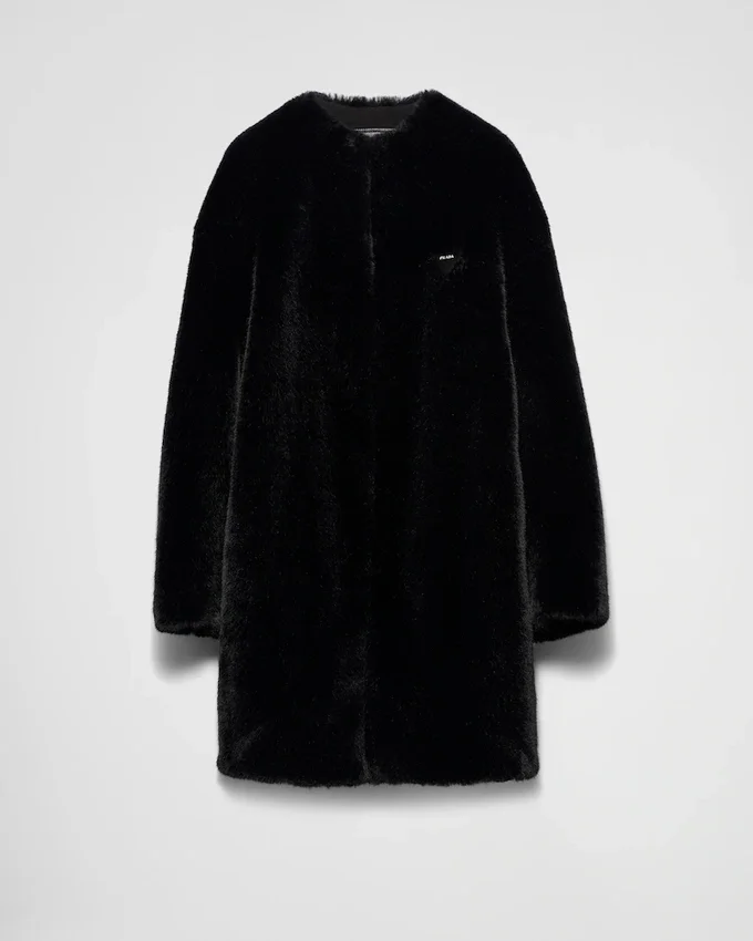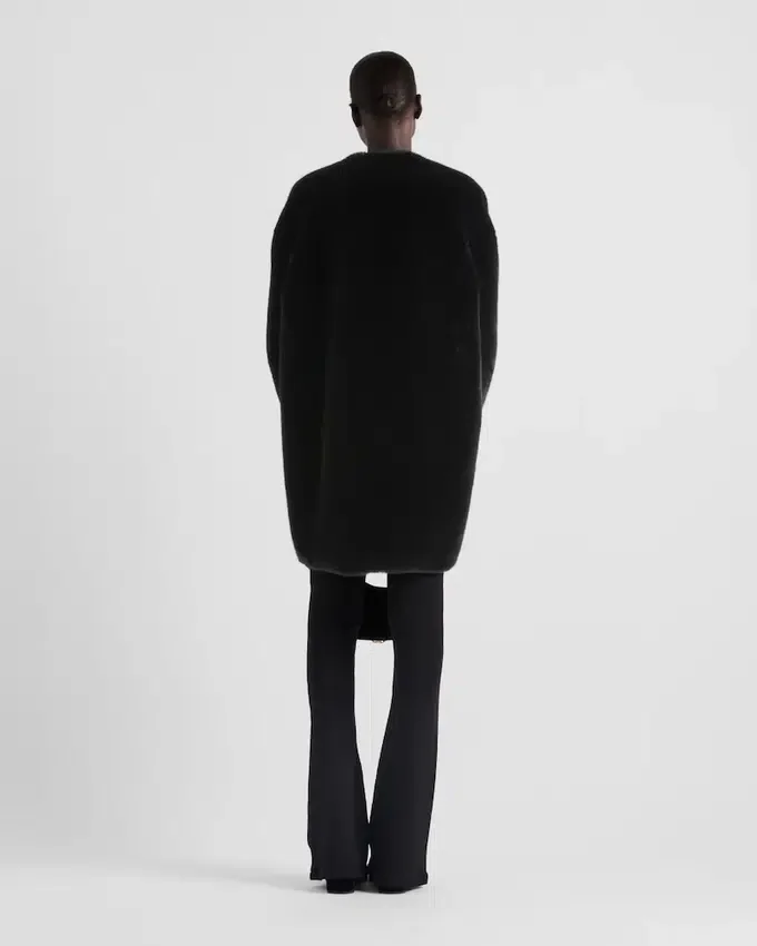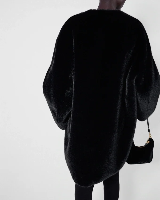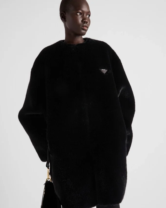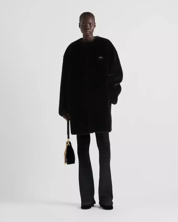 This Soft, Elegant Deconstructed Coat is Made of Aspen. The Sheen of the Material Creates a Delicate Play of Light, Giving the Garment a Sophisticated Yet Modern Tone. The Triangle Logo Stands out in a Contrasting Material, Adding a Contemporary Note to the Design.
