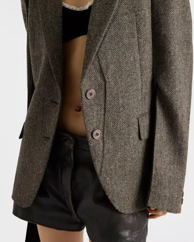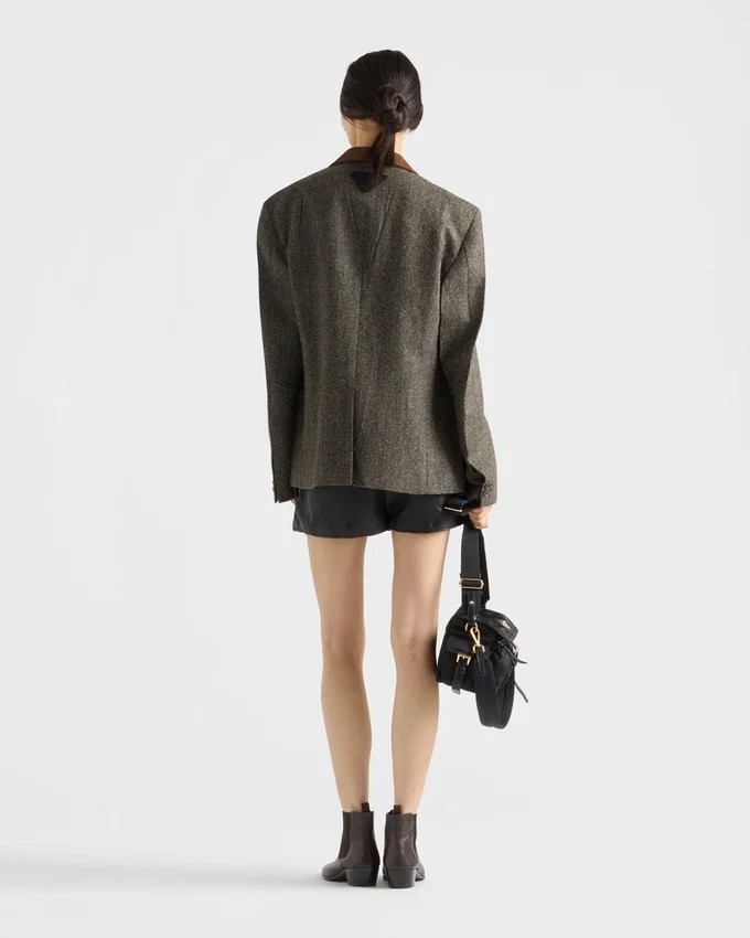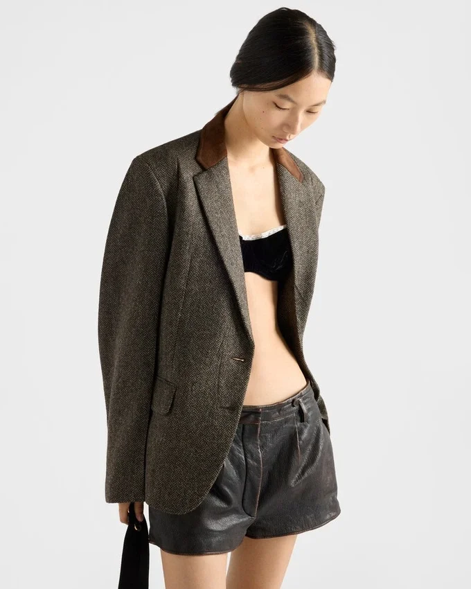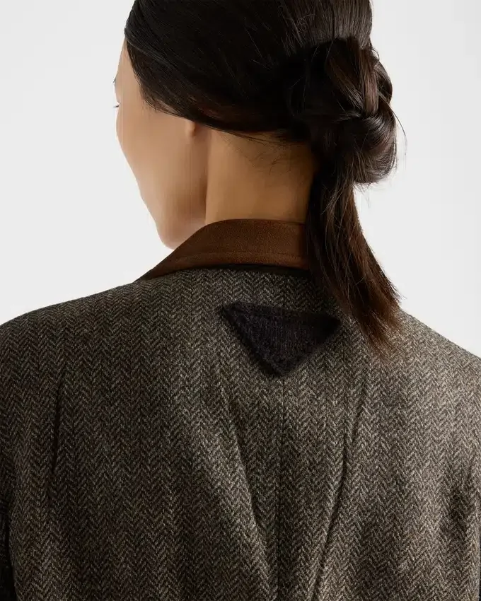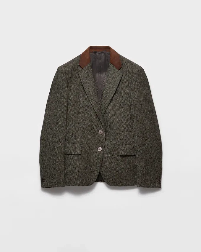 Sophisticated Winter Textures Enrich This Jacket with Retro Charm. The Garment Made from Shetland Wool with a Chevron Pattern Features a Masculine Cut with Classic Lapels Trimmed with a Suede Insert.