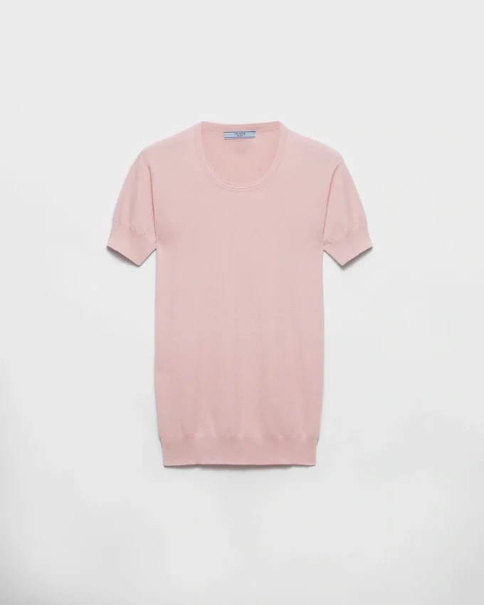 This Silk and Cotton Short-Sleeved Sweater, a Prada Wardrobe Classic, Has a Sleek Silhouette. The Short-Sleeved Style with Ribbed Knit Crew-Neck, Sleeve Trim and Hem is Completed by the Tonal Triangle Logo.
