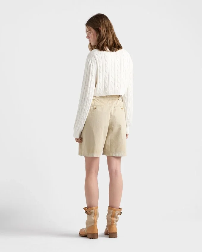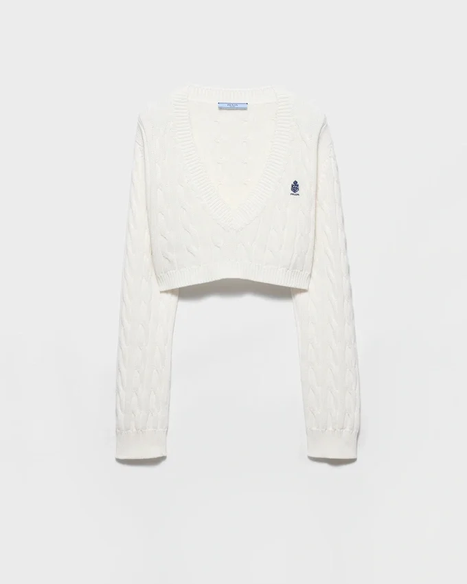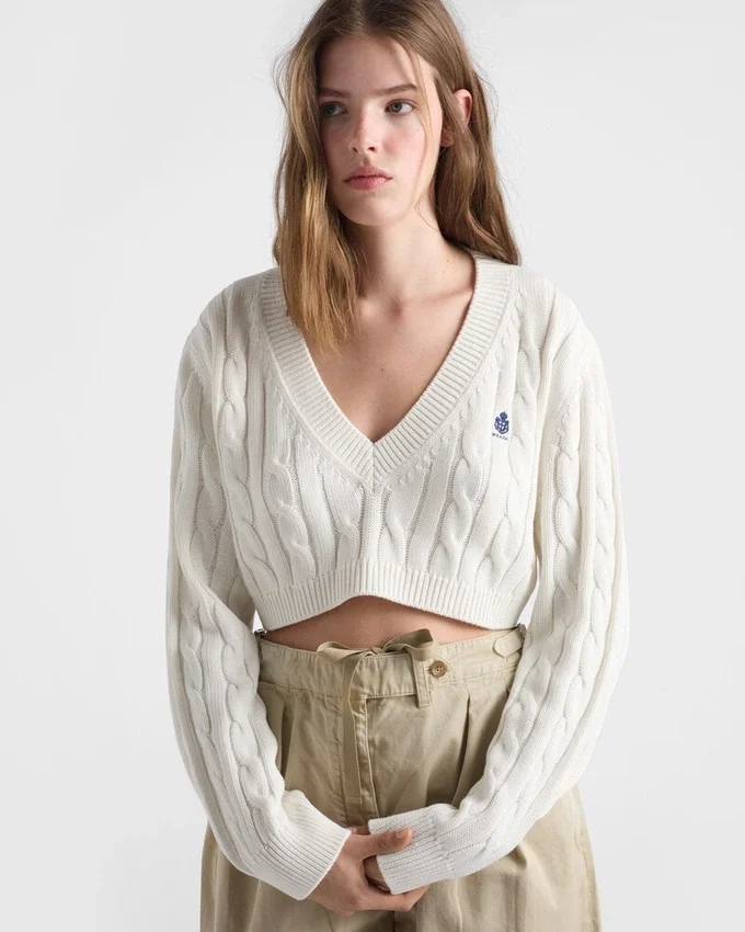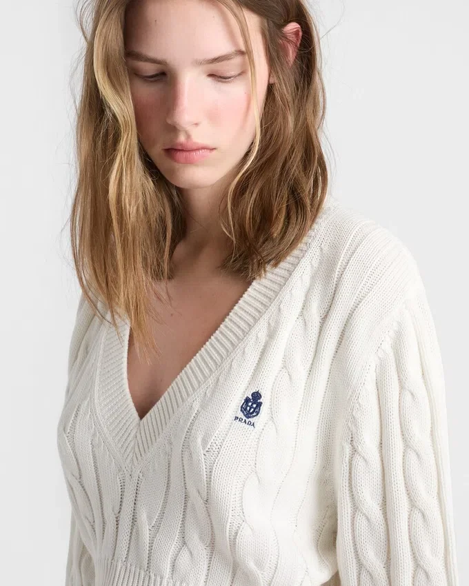 The Comfortable Lightness of Cotton Defines This Sweater with Sleek, Classic Lines. The Cropped Silhouette is Characterized by a V-Neck and Cable-Knit Motif.
