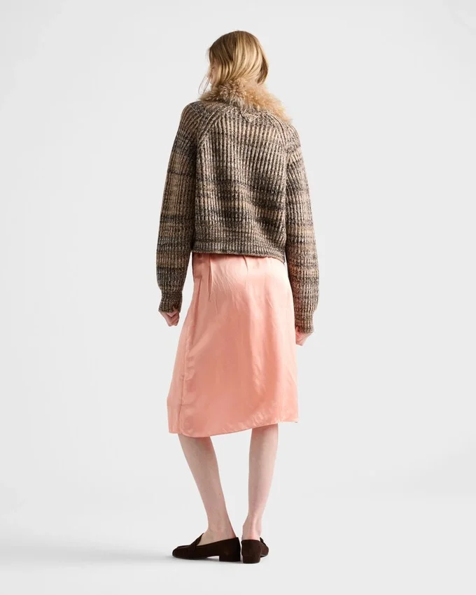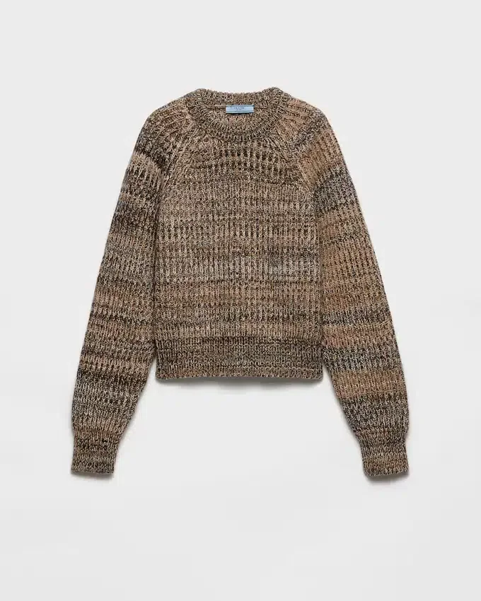 Relaxed Volumes and a Distinct Texture. This Cashmere and Wool Ribbed Knit Sweater Combines a Raglan Shoulder, Oversized Fit, and Triangle Logo for Casual Yet Structured Elegance.