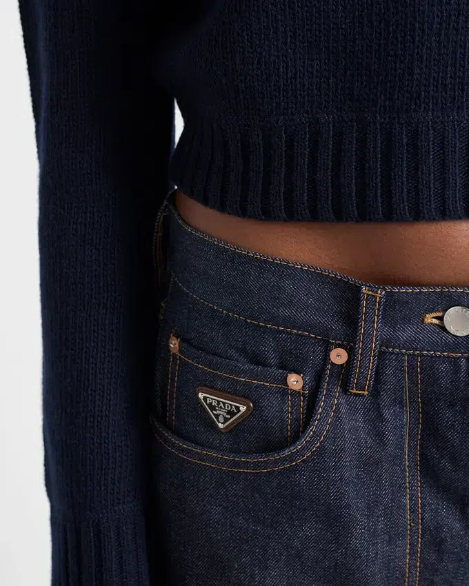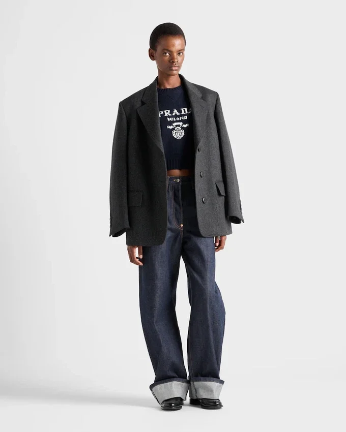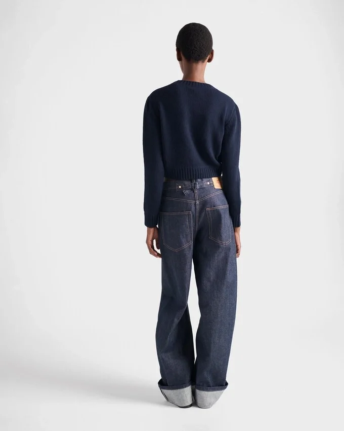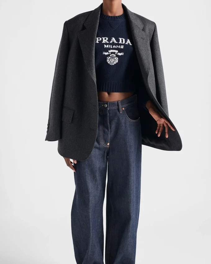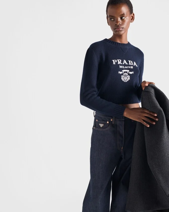 The Prada Logo is Featured in the Contrasting Intarsia Knit That Decorates This Wool and Cashmere Crew-Neck Sweater. The Sleek, Iconic Garment Has a Boxy Silhouette and is Completed with Ribbed Knit Trim.