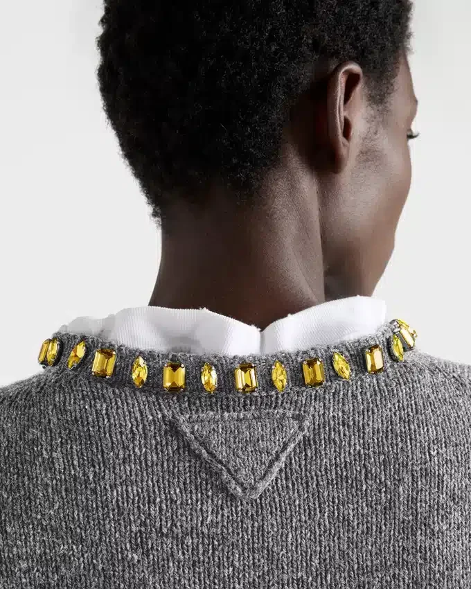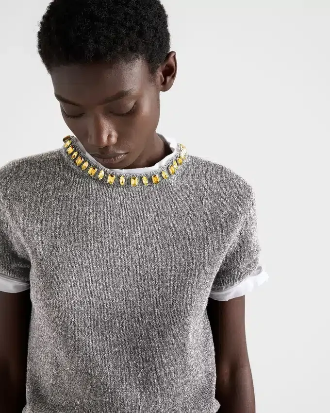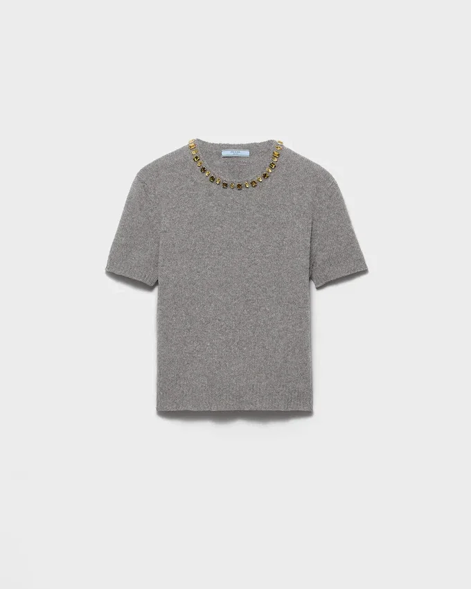 Jewel Details Brighten This Short-Sleeved Sweater Characterized by an Unexpected Combination of Lines and Materials. The Style is Made with a Wool and Cashmere Yarn That Gives the Silhouette Softness and Structure and is Completed by a Crystal Embellishment on the Crew Neck.