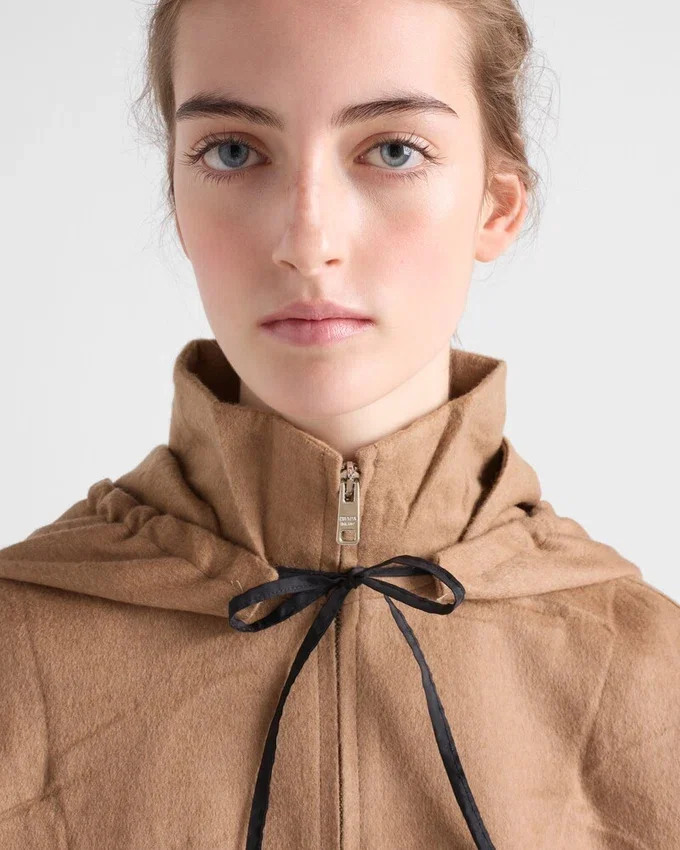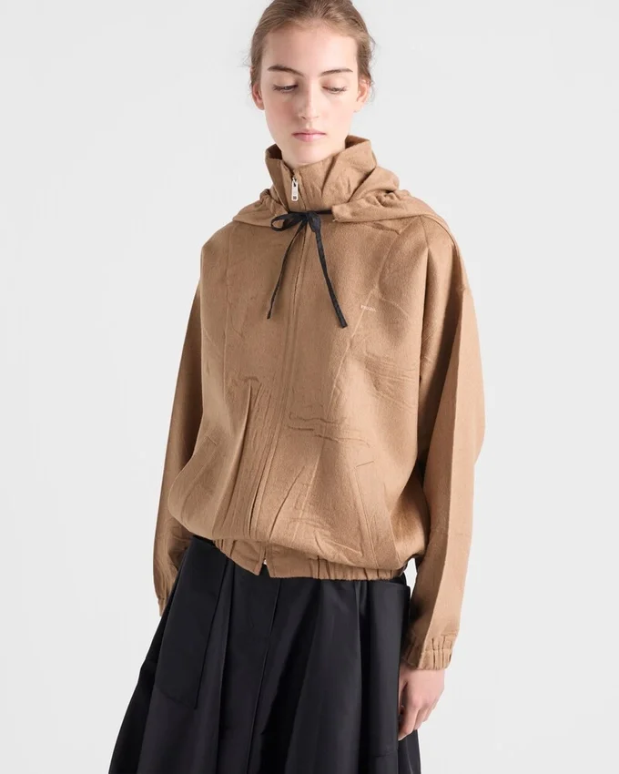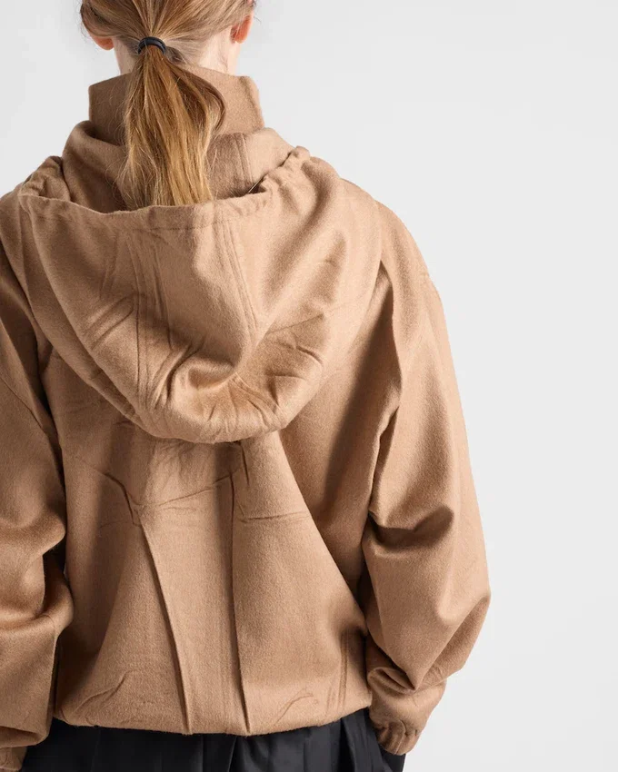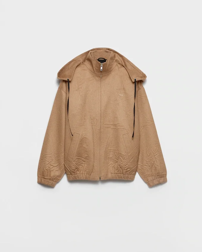 This Sophisticated Blouson Jacket with Minimalist Lines and a Distinctive Style Combines Sporty and Functional Details. The Garment Made of Camel Hair with a Vintage Finish is Defined by Its Stand-Up Collar and Oversized Hood, While the Lettering Logo Adds a Discreet and Refined Touch.