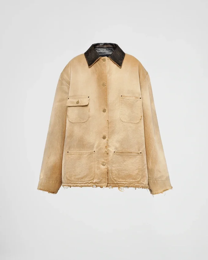 Oversized Lines Borrowed from Menswear Redefine the Silhouette of This Canvas Jacket Enhanced with a Distressed Effect. The Casual Style, Characterized by the Leather Collar in a Contrasting Color and Several Patch Pockets is Completed by the Iconic Signature of the Leather Triangle Logo Reinterpreted with a Conceptual Design.