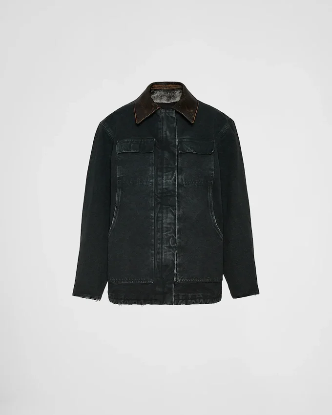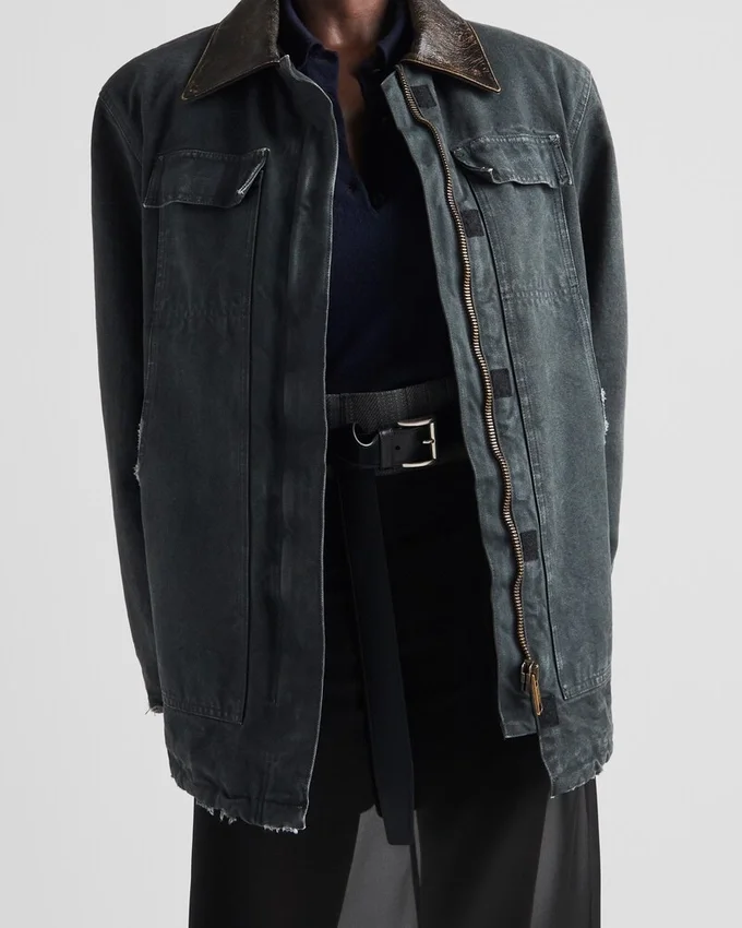 This Canvas Trucker Jacket Features an Oversized Silhouette, Emphasized by the Worn Finish That Gives the Style a Unique and Contemporary Touch. The Utility-Inspired Garment with Leather Collar is Decorated with the Triangle Logo.