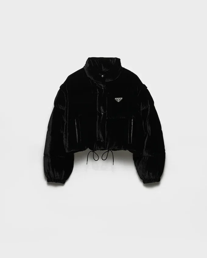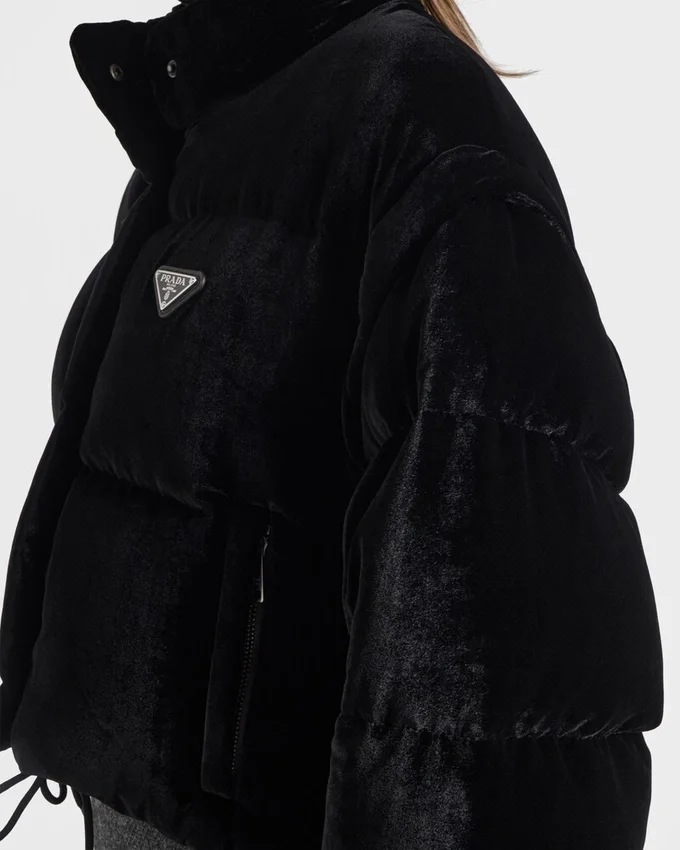 Oversized Volumes and New Materials Mix to Create a New Outerwear Concept That Reflects the Characteristic Duality of Prada Collections. This Cropped Velvet Down Jacket Reveals Its Versatile Hybrid Soul, Transforming into a Vest Thanks to the Removable Sleeves. The Brand’s Emblematic Enameled Metal Triangle Logo Decorates the Design.