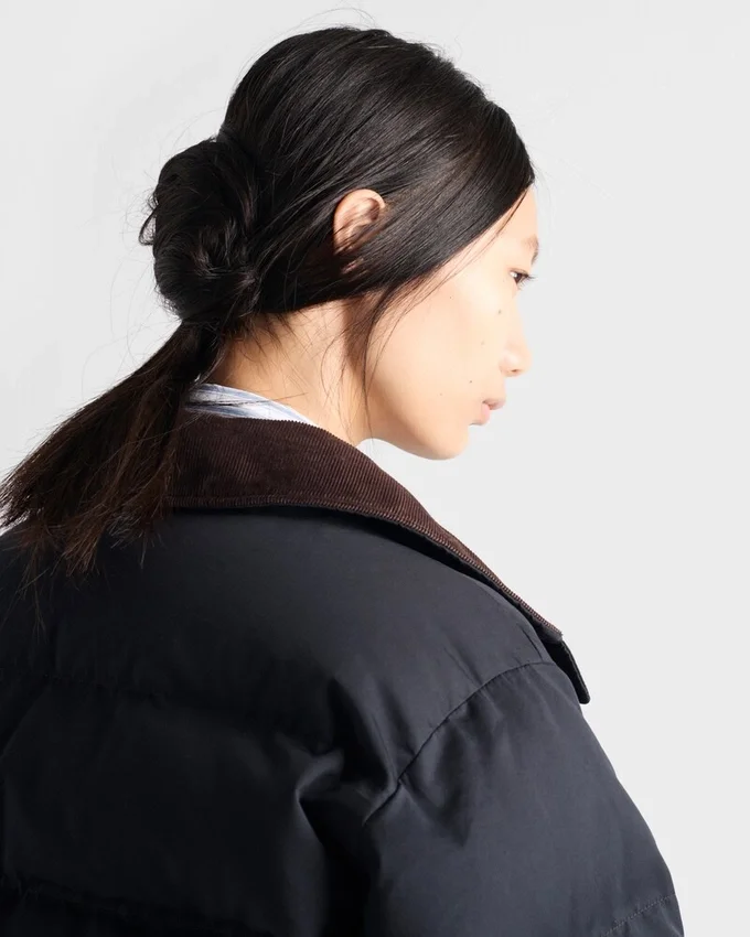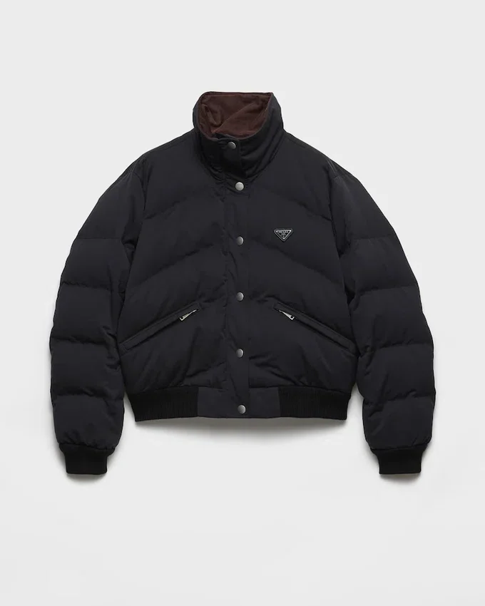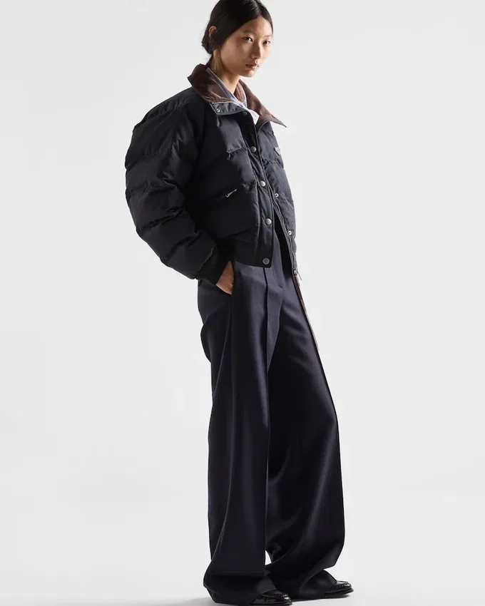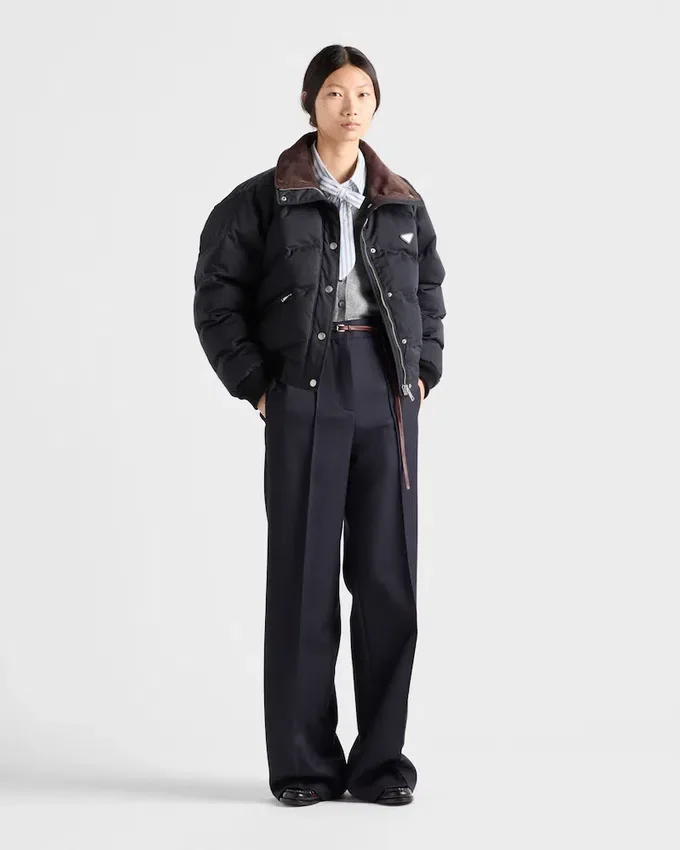 Winter Textures and Volumes Define This Cropped Down Jacket with Goose Down Padding. The Warm and Functional Garment is Enriched with Refined Notes Like the Velvet Collar Lining, Diagonal Stitching, and Knit Details. The Enameled Metal Triangle Logo Completes Jacket with Contemporary Style.