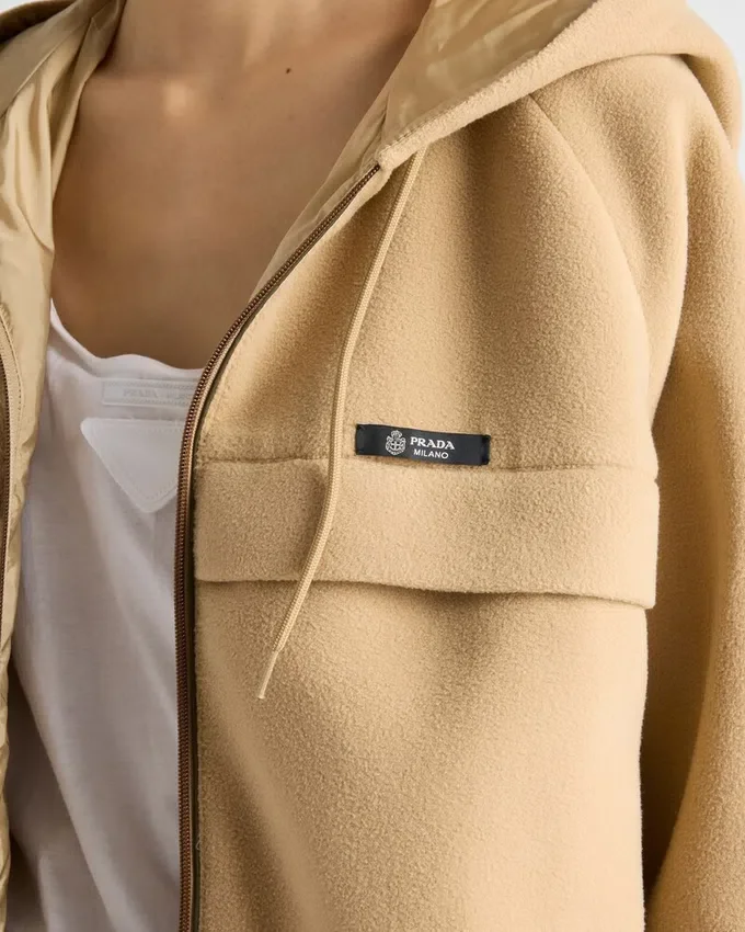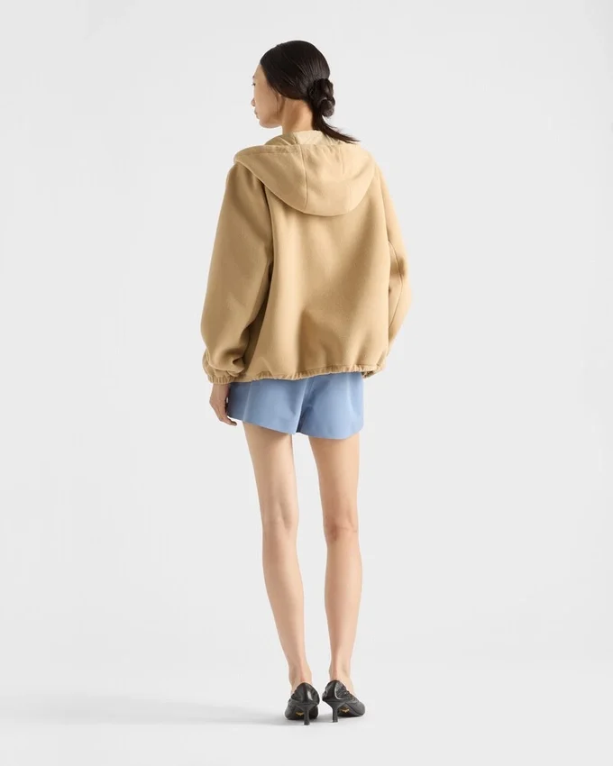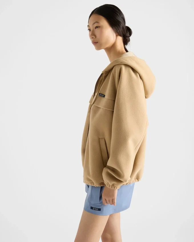 Sportiness and Craftsmanship Meet: The Hood and Raglan Sleeves Define the Contemporary, Technical Garment, an Emblem of Prada Style.