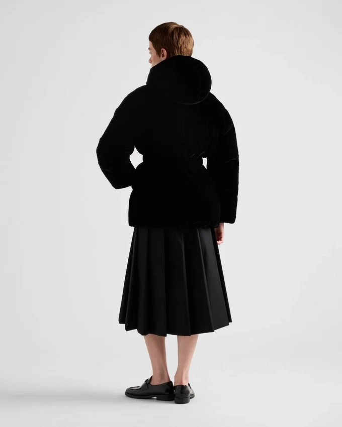 This Versatile, Contemporary Velvet Down Jacket is Defined by an Elasticized Band That Highlights the Waist and is Decorated with the Iconic Triangle Logo.