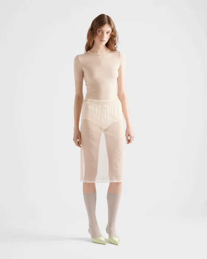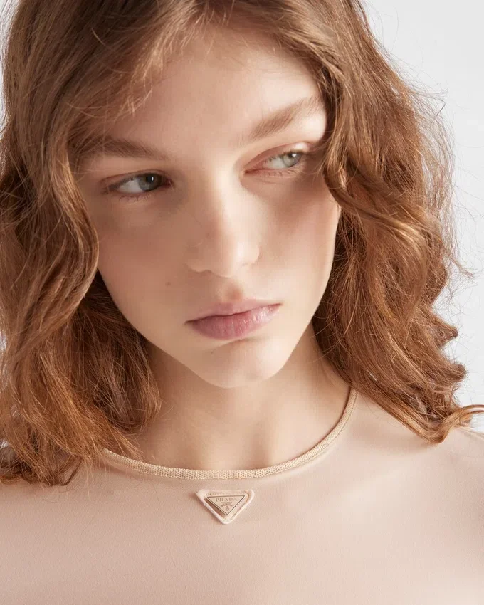 This Short-Sleeved Stretch Fabric Tee Has a Sleek Silhouette with a Slim Fit, Decorated with the Iconic Enameled Metal Triangle Logo.