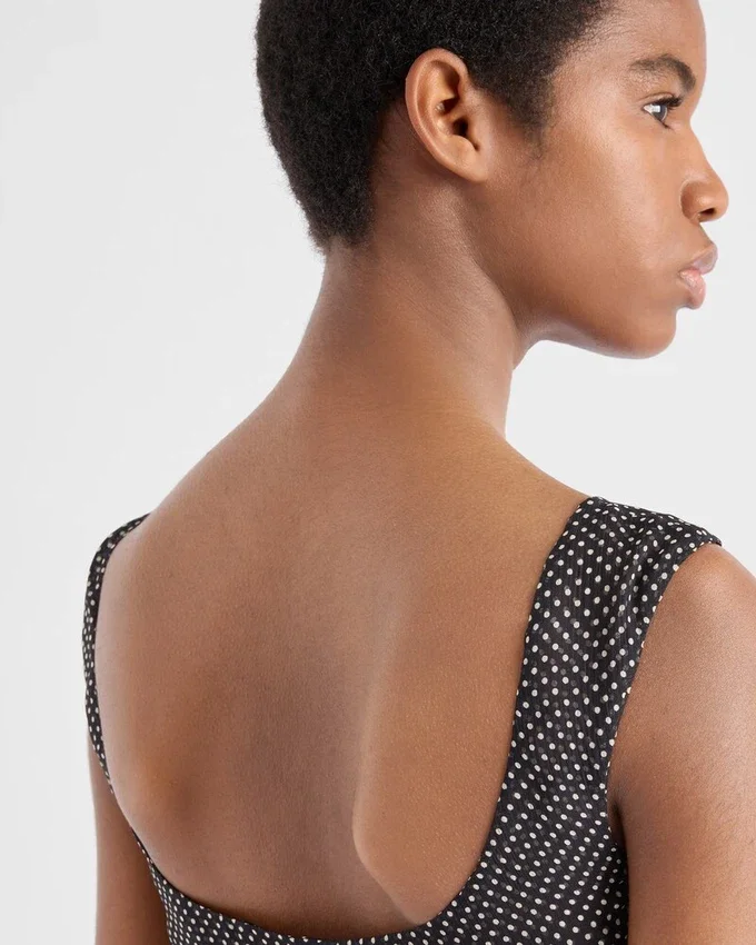 The Delicate Elegance of Silk Chiffon Defines This Bralette Top with Plunging Neckline Animated by a Refined Polka-Dot Print.