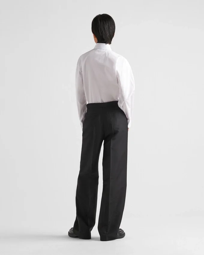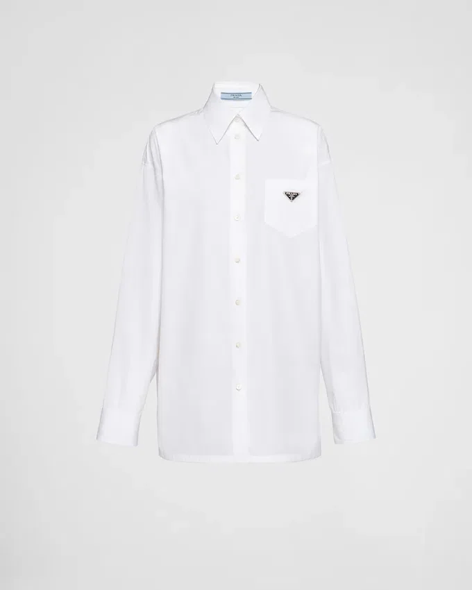 The Classic Men’s Shirt is Reinterpreted in a Modern, Feminine Way on This Style Made of Poplin. The Design is Embellished with Sleek Details and Decorated with the Enameled Metal Triangle Logo.