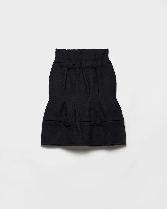The Codes of Femininity Are Recontextualized in Designs That Transform Classic Wardrobe Pieces. This Chevron Wool Skirt Features a Structured Silhouette, Characterized by Voluminous Shapes, Draping, and Oversized Tone-On-Tone Buttons. The Deliberately Unfinished Details Suggest New Interactions Between the Raw Beauty of Imperfection and Sartorial Elegance.