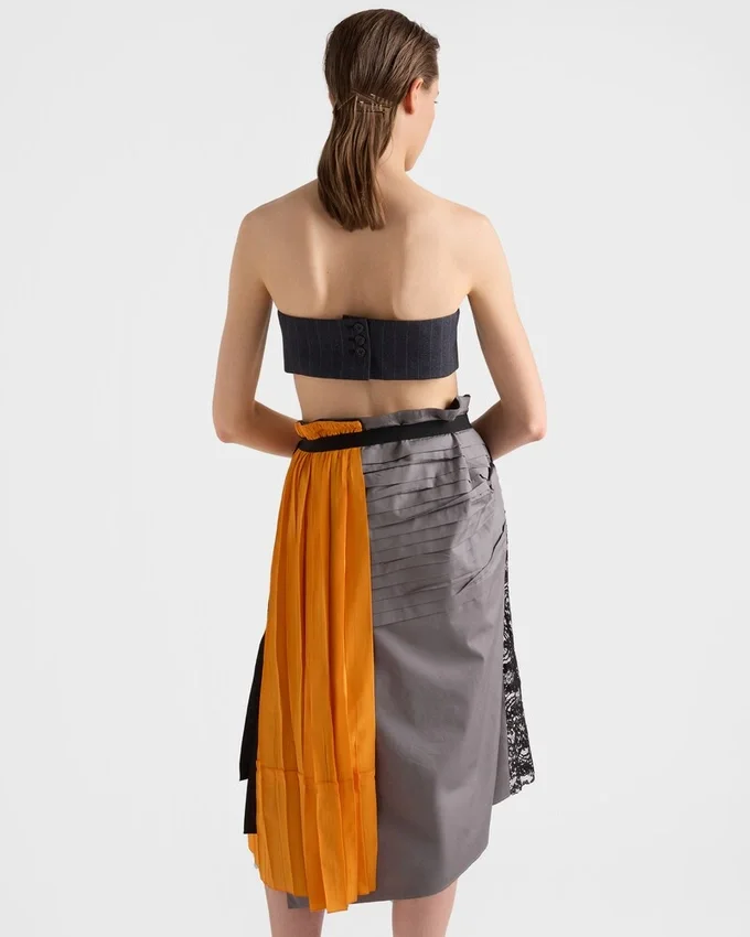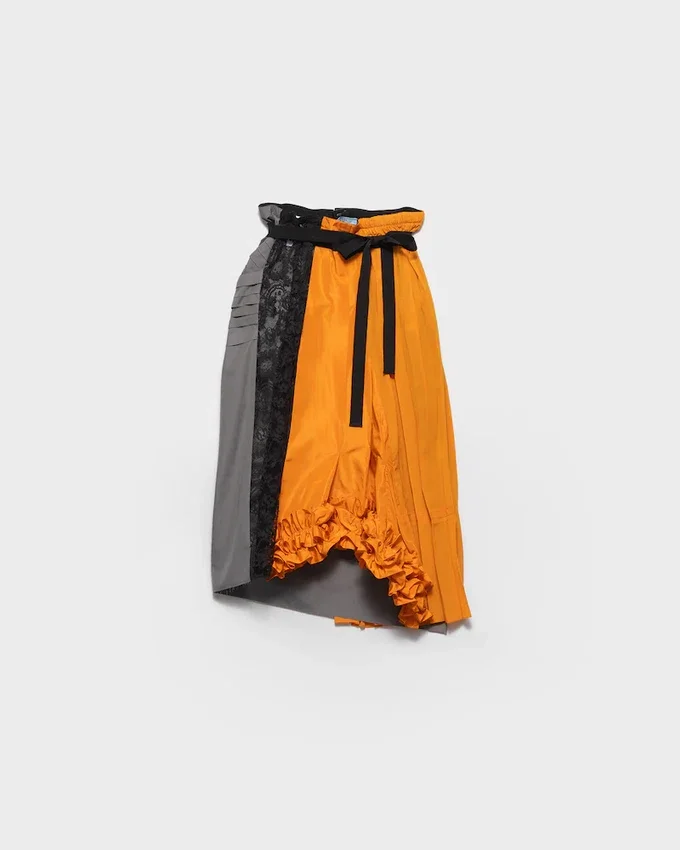 A Bold Encounter Between Fine Materials and Iconic Prada Lines Creates This Skirt with a Distinctive Character. The Patchwork Technique Sculpts an Asymmetrical Silhouette, Enriched with Ruching, Lace and Pleats That Create Dynamic Volumes, an Expression of a Free and Unconventional Elegance.